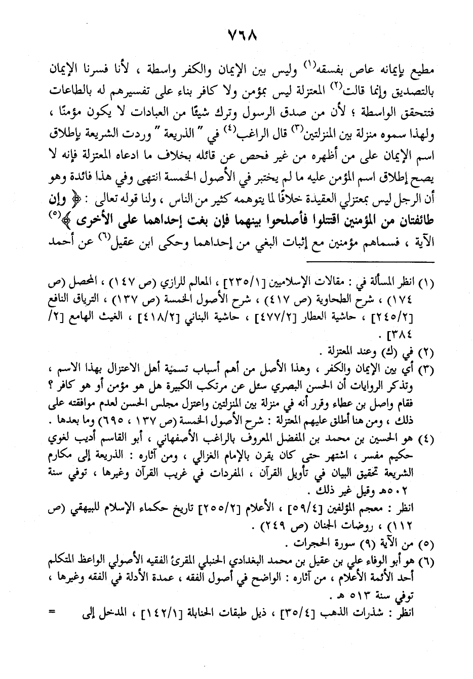 مطيع بإيمانه عاص بفسقه وليس بين الإيمان والكفر وساطة، لأنا فسرنا الإيمان بالتصديق وإنما قالت المعتزلة ليس بمؤمن ولا كافر بناء على تفسيرهم له بالطاعات فتتحقق الواسطة، لأن من صدق الرسول وترك شيئا من العبادات لا يكون مؤمنا ولهذا سموه منزلة بين المنزلتين قال الراغب في (الذريعة) وردت الشريعة بإطلاق اسم الإيمان على من أظهره من غير فحص عن قائله بخلاف ما ادعاه المعتزلة فإنه لا يصح إطلاق اسم المؤمن عليه ما لم يختبر في الأصول الخمسة انتهى وفي هذا فائدة وهو أن الرجل ليس بمعتزلي العقيدة خلافا لما يتوهمه كثير من الناس ولنا قوله تعالى: {وإن طائفتان من المؤمنين اقتتلوا فأصلحوا بينهما فإن بغت إحداهما على الأخرى} الآية. فسماهم مؤمنين مع إثبات البغي من إحداهما وحكى ابن عقيل عن أحمد