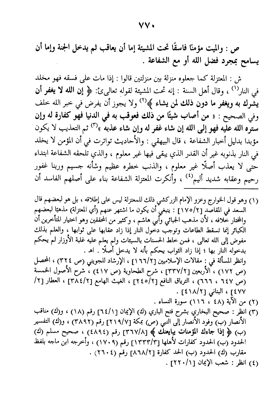 ش: المعتزلة كما جعلوه منزلة بين منزلتين قالوا: إذا مات على فسقه فهو مخلد في النار وقال أهل السنة: إنه تحت المشيئة لقوله تعالى: {إن الله لا يغفر أن يشرك به ويغفر ما دون ذلك لما يشاء} ولا يجوز أن يفرض في خبر الله خلف وفي الصحيح: ((من أصاب شيئا من ذلك فعوقب به في الدنيا فهو كفارة له وإن ستره الله عليه فهو إلى الله إن شاء غفر له وإن شاء عذبه)) ثم التعذيب لا يكون مؤبدا بدليل أخبار الشفاعة، قال البيهقي: والأحاديث تواترت في أن المؤمن لا يخلد في النار بذنوبه غير أن القدر الذي يبقى فيها غير معلوم، والذي تلحقه الشفاعة ابتداء حتى لا يعذب أصلا غير معلوم، والذنب خطره عظيم وشأنه جسيم وربنا غفور رحيم وعقابه شديد أليم، وأنكرت المعتزلة الشافعة بناء على أصلهم الفاسد أن