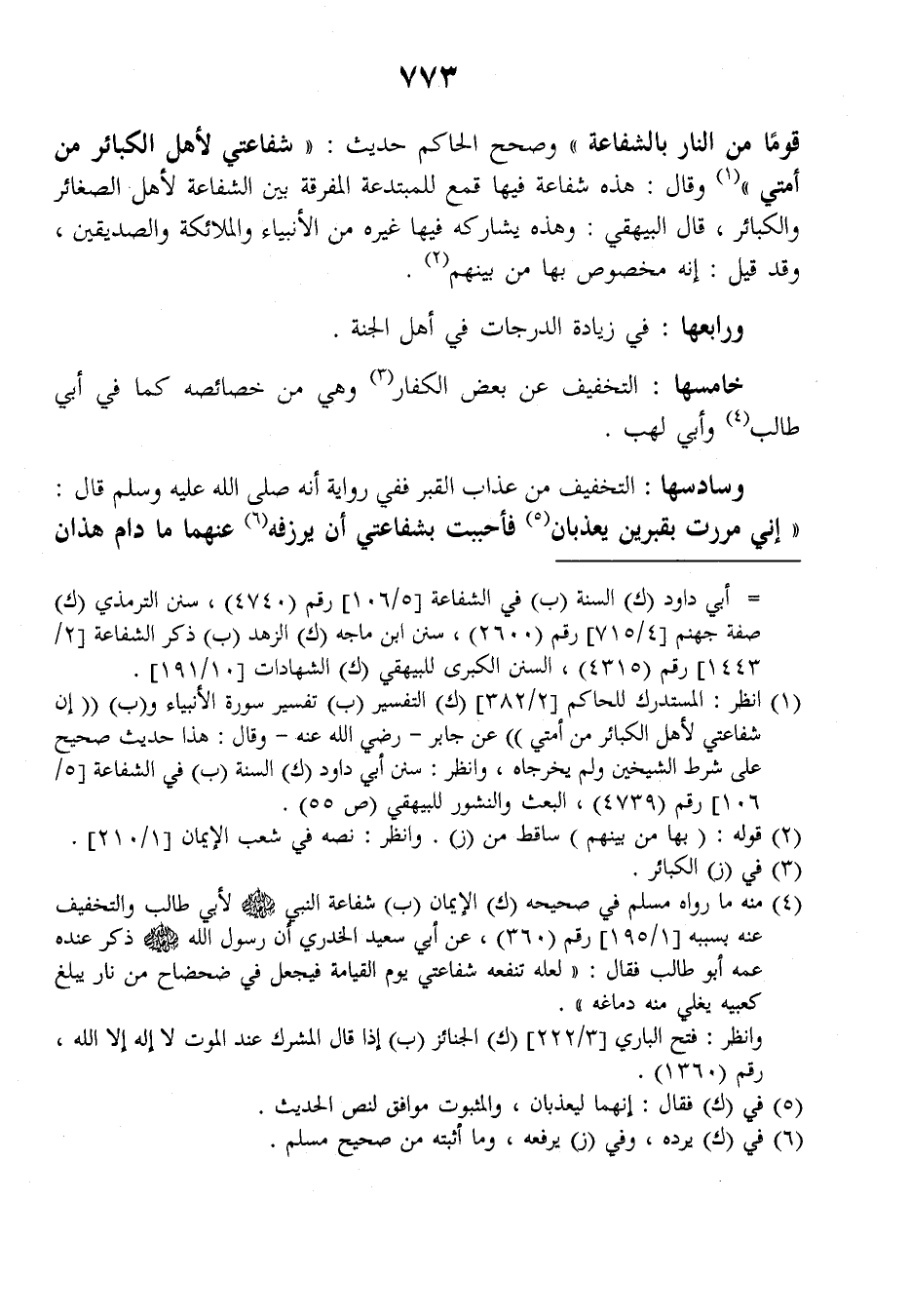 قوما من النار بالشفاعة)) وصحح الحاكم حديث: ((شفاعتي لأهل الكبائر من أمتي)) وقال: هذه شفاعة فيها قمع للمبتدعة المفرقة بين الشفاعة لأهل الصغائر والكبائر قال البيهقي: وهذه يشاركه فيها غيره من الأنبياء والملائكة والصديقين، وقد قيل: إنه مخصوص بها من بينهم.