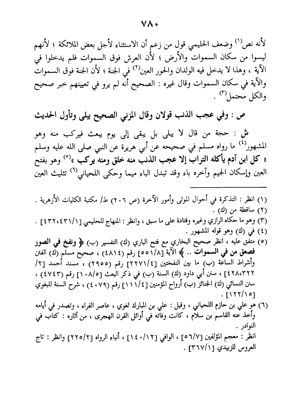 ش: حجة من قال لا يبلى بل يبقى إلى يوم يبعث فيركب منه وهو المشهور ما رواه مسلم في صحيحه عن أبي هريرة عن النبي صلى الله عليه وسلم: ((كل ابن آدم يأكله التراب إلا عجب الذنب منه خلق ومنه يركب)) وهو بفتح العين وإسكان الجيم وآخره باء وقد تبدل الباء ميما وحكى اللحياني تثليث العين