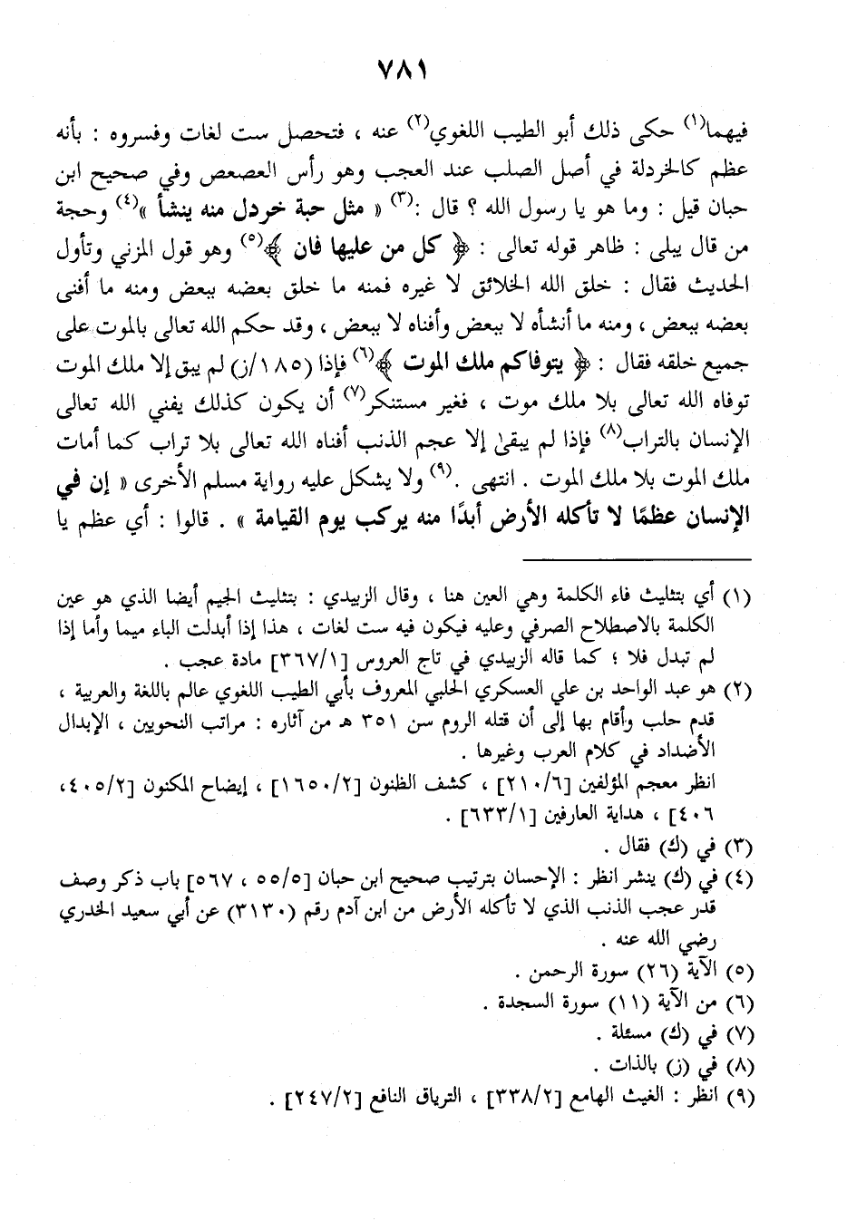 فيهما حكى ذلك أبو الطيب اللغوي عنه فتحصل ست لغات وفسروه: بأنه عظم كالخردلة في أصل الصلب عند العجب وهو رأس العصعص وفي صحيح ابن حبان قيل: وما هو يا رسول الله؟ قال: ((مثل حبة خردل منه ينشأ)) وحجة من قال يبلى: ظاهر قوله تعالى: {كل من عليها فان} وهو قول المزني وتأول الحديث فقال: خلق الله الخلائق لا غيره فمنه ما خلق بعضه ببعض ومنه ما أفنى بعضه ببعض، ومنه ما أنشأه لا ببعض وأفناه لا ببعض، وقد حكم الله تعالى بالموت على جميع خلقه فقال: {يتوفاكم ملك الموت} فإذا (١٨٥/ز) لم يبق إلا ملك الموت توفاه الله تعالى بلا ملك موت، فغير مستنكر أن يكون كذلك يفني الله تعالى الإنسان بالتراب فإذا لم يبقى إلا عجم الذنب أفناه الله تعالى بلا تراب كما أمات ملك الموت بلا ملك الموت. انتهى.
