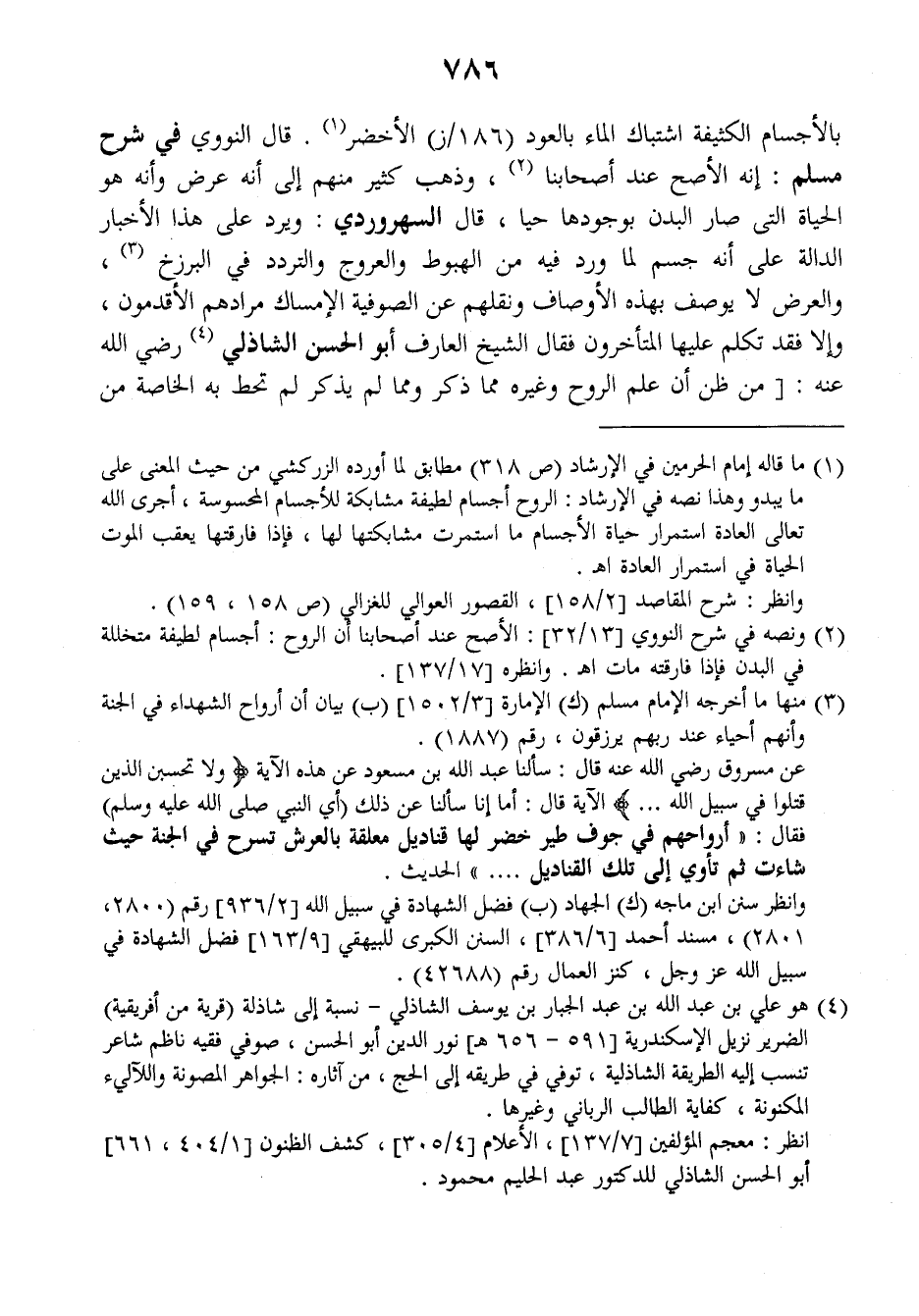 بالأجسام الكثيفة اشتباك الماء بالعود (١٨٦/ز) الأخضر قال النووي في (شرح مسلم): إنه الأصح عند أصحابنا وذهب كثير منهم إلى أنه عرض وإنه هو الحياة التي صار البدن بوجودها حيا، قال السهروردي: ويرد على هذا الأخبار الدالة على أنه جسم لما ورد فيه من الهبوط والعروج والتردد في البرزخ والعرض لا يوصف بهذه الأوصاف ونقلهم عن الصوفية الإمساك مرادهم الأقدمون وإلا فقد تكلم عليها المتأخرون فقال الشيخ العارف أبو الحسن الشاذلي رضي الله عنه: من ظن أن علم الروح وغيره مما ذكر ومما لم يذكر لم تحط به الخاصة من