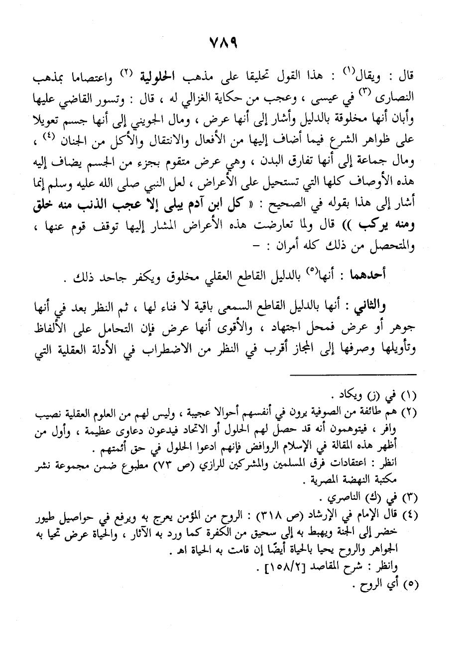 وقال: ويقال: هذا القول تحليقا على مذهب الحلولية واعتصاما بمذهب النصارى في عيسى، وعجب من حكاية الغزالي له، قال: وتسور القاضي عليها وأبان أنها مخلوقة بالدليل وأشار إلى أنها عرض ومال الجويني إلى أنها جسم تعويلا على ظواهر الشرع فيما أضاف إليها من الأفعال والانتقال والأكل من الجنان، ومال جماعة إلى أنها تفارق البدن، وهي عرض متقوم بجزء من الجسم يضاف إليه هذه الأوصاف كلها التي تسحيل على الأعراض، لعل النبي صلى الله عليه وسلم إنما أشار إلى هذا بقوله في الصحيح: ((كل ابن آدم يبلى إلا عجب الذنب منه خلق ومنه يركب)) قال ولما تعارضت هذه الأعراض المشار إليها توقف قوم عنها والمتحصل من ذلك كله أمران: