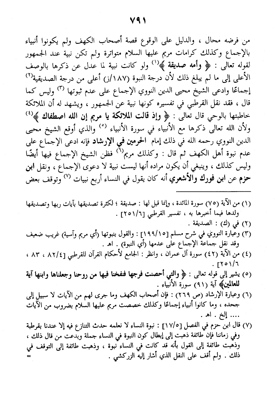 من فرضه محال، والدليل على الوقوع قصة أصحاب الكهف ولم يكونوا أنبياء بالإجماع وكذلك كرامات مريم عليها السلام متواترة ولم تكن نبية عند الجمهور لقوله تعالى: {وأمه صديقة} ولو كانت نبية لما عدل عن ذكرها بالوصف الأعلى إلى ما لم يبلغ ذلك لأن درجة النبوة (١٨٧/ز) أعلى من درجة الصديقية إجماعا وادعى الشيخ محيي الدين النووي الإجماع على عدم ثبوتها وليس كما قال، فقد نقل القرطبي في تفسيره كونها نبية عن الجمهور، ويشهد له أن الملائكة خاطبتها بالوحي قال تعالى: {وإذ قالت الملائكة يا مريم إن الله اصطفاك} ولأن الله تعالى ذكرها مع الأنبياء في سورة الأنبياء والذي أوقع الشيخ محيي الدين النووي رحمه الله في ذلك إمام الحرمين في (الإرشاد) فإنه ادعى الإجماع على عدم نبوة أهل الكهف ثم قال: وكذلك مريم فظن الشيخ الإجماع فيها أيضا وليس كذلك، وينبغي أن يكون مراده أنها ليست نبية لا دعوى الإجماع ونقل ابن حزم عن ابن فورك والأشعري أنه كان يقول في النساء أربع نبيات وتوقف بعض