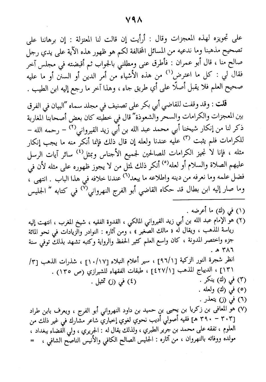 قلت: وقد وقفت للقاضي أبي بكر على تصنيف في مجلد سماه (البيان في الفرق بين المعجزات والكرامات والسحر والشعوذة) قال في خطبته كان بعض أصحابنا المغاربة ذكر لنا من إنكار شيخنا أبي محمد عبد الله بن أبي زيد القيرواني رحمه الله للكرامات فلم يثبت عليه عندنا ولعله إن قال ذلك فإنما أنكر منه ما يجب إنكار مثله، فإنا لا نجيز الكرامات للصالحين لجميع الأجناس وبمثل سائر آيات الرسل عليهم الصلاة والسلام أو لعله أنكر ذلك لمثل من لا يجوز ظهوره على مثله لأن في فضل علمه وما نعرفه من دينه واطلاعه ما يبعد عندنا خلافه في هذا الباب. انتهى، وما صار إليه ابن بطال قد حكاه القاضي أبو الفرج النهرواني في كتابه (الجليس