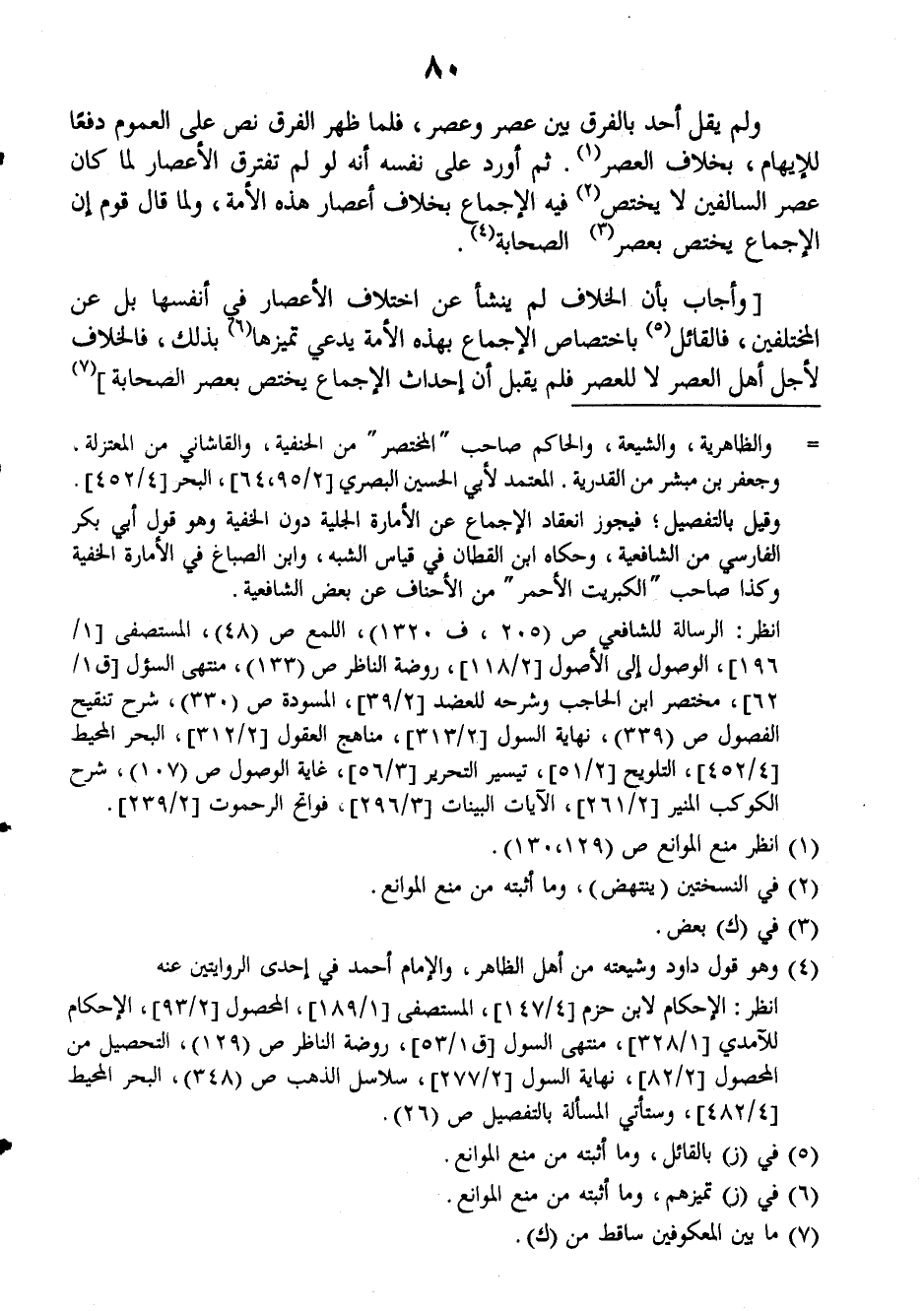 ولم يقل أحد بالفرق بين عصر وعصر، فلما ظهر الفرق نص على العموم دفعاً للإيهام، بخلاف العصر، ثم أورد على نفسه أنه لو لم يفترق الأعصار، لما كان عصر السالفين لا يختص فيه الإجماع بخلاف أعصار هذه الأمة، ولما قال قوم إن الإجماع يختص بعصر الصحابة.