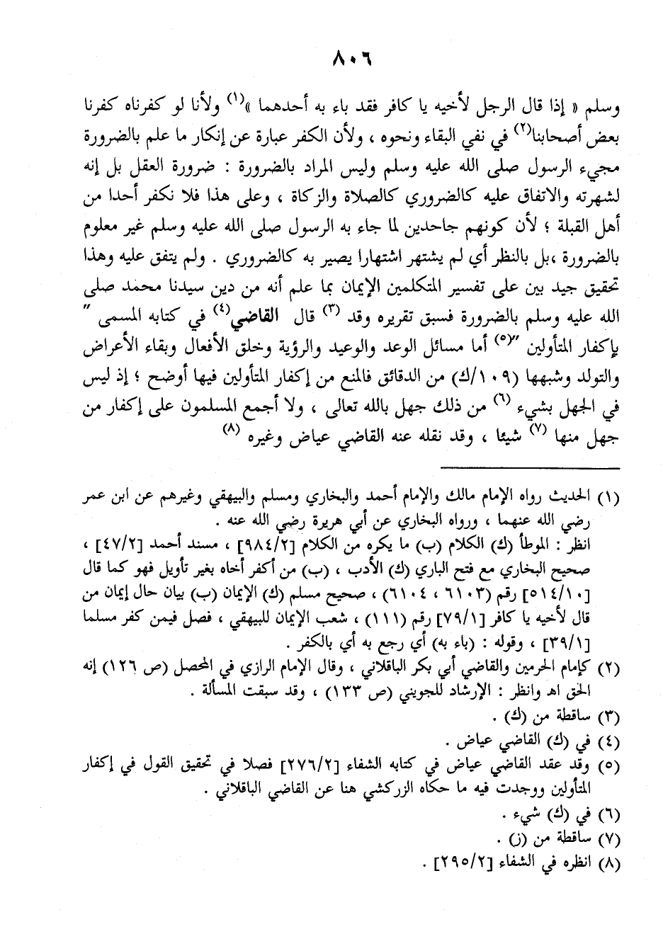وسلم: ((إذا قال الرجل لأخيه يا كافر فقد باء به أحدهما)) ولأنا لو كفرناه كفرنا بعض أصحابنا في نفي البقاء ونحوه، ولأن الكفر عبارة عن إنكار ما علم بالضرورة مجيء الرسول صلى الله عليه وسلم وليس المراد بالضرورة: ضرورة العقل بل إنه لشهرته والاتفاق عليه كالضروري كالصلاة والزكاة، وعلى هذا فلا نكفر أحدا من أهل القبلة، لأن كونهم جاحدين لما جاء به الرسول صلى الله عليه وسلم غير معلوم بالضرورة بل بالنظر أي لم يشتهر اشتهارا يصير به كالضروري. ولم يتفق عليه وهذا تحقيق جيد بين على تفسير المتكلمين الإيمان بما علم أنه من دين سيدنا محمد صلى الله عليه وسلم بالضرورة فسبق تقريره وقد قال القاضي في كتابه المسمى (بإكفار المتأولين) أما مسائل الوعد والوعيد والرؤية وخلق الأفعال وبقاء الأعراض والتولد وشبهها (١٠٩/ك) من الدقائق فالمنع، من إكفار المتأولين فيها أوضح، إذ ليس في الجهل بشيء من ذلك جهل بالله تعالى ولا أجمع المسلمون على إكفار من جهل منها شيئا، وقد نقله عنه القاضي عياض وغيره.