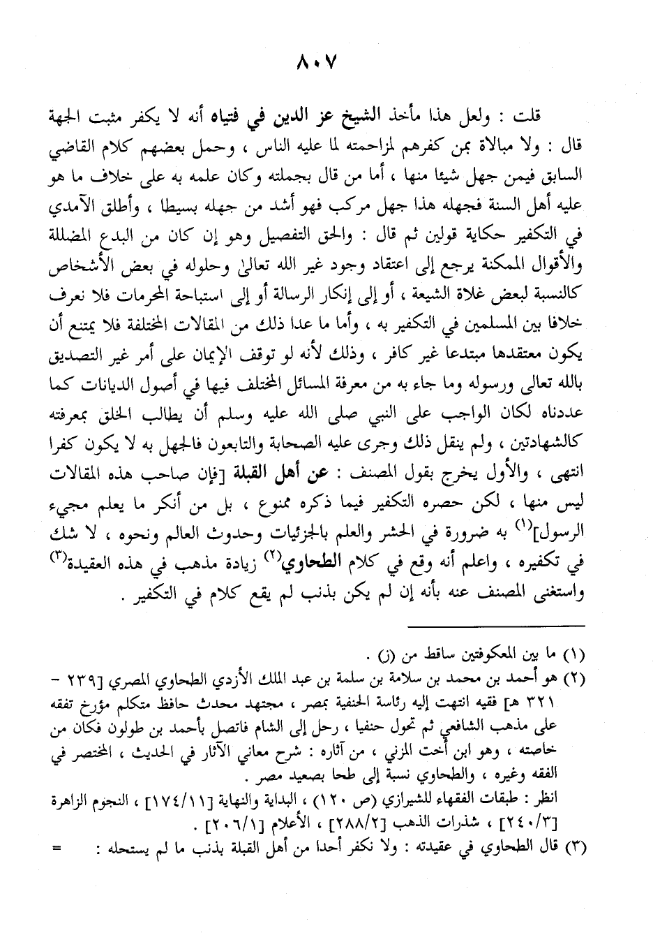 قلت: ولعل هذا مأخذ الشيخ عز الدين في فتياه أنه لا يكفر مثبت الجهة قال: ولا مبالاة بمن كفرهم لمزاحمته لما عليه الناس، وحمل بعضهم كلام القاضي السابق فيمن جهل شيئا منها، أما من قال بجملته وكان علمه به على خلاف ما هو عليه أهل السنة فجهله هذا جهل مركب فهو أشد من جهله بسيطا، وأطلق الآمدي في التكفير حكاية قولين ثم قال: والحق التفصيل وهو إن كان من البدع المضللة والأقوال الممكنة يرجع إلى اعتقاد وجود غير الله تعالى وحلوله في بعض الأشخاص كالنسبة لبعض غلاة الشيعة، أو إلى إنكار الرسالة أو إلى استباحة المحرمات فلا نعرف خلافا بين المسلمين في التكفير به وأما ما عدا ذلك من المقالات المختلفة فلا يمتنع أن يكون معتقدها مبتدعا غير كافر وذلك لأنه لو توقف الإيمان على أمر غير التصديق بالله تعالى ورسوله وما جاء به من معرفة المسائل المختلف فيها في أصول الديانات كما عددناه لكان الواجب على النبي صلى الله عليه وسلم أن يطالب الخلق بمعرفته كالشهادتين، ولم ينقل ذلك وجرى عليه الصحابة والتابعون فالجهل به لا يكون كفرا انتهى. والأول يخرج بقول المصنف: عن أهل القبلة فإن صاحب هذه المقالات ليس منها، لكن حصره التكفير فيما ذكره ممنوع، بل من أنكر ما يعلم مجيء الرسول به ضرورة في الحشر والعلم بالجزئيات وحدوث العالم ونحوه، لا شك في تكفيره واعلم أنه وقع في كلام الطحاوي زيادة مذهب في هذه العقيدة واستغنى المصنف عنه بأنه إن لم يكن بذنب لم يقع كلام في التكفير.