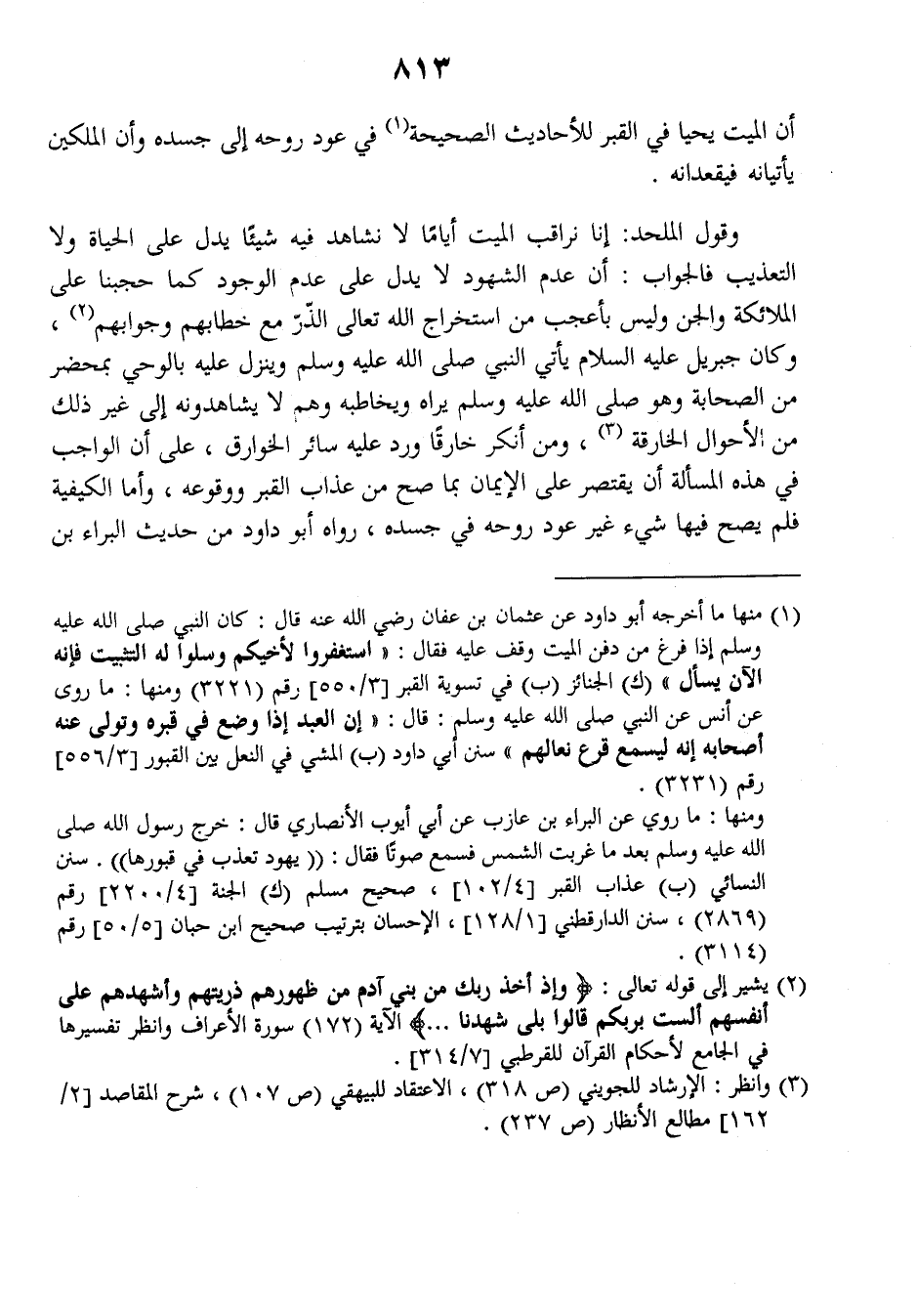وقول الملحد: إنا نراقب الميت أياما لا نشاهد فيه شيئا يدل على الحياة ولا التعذيب فالجواب: أن عدم الشهود لا يدل على عدم الوجود كما حجبنا على الملائكة والجن وليس بأعجب من استخراج الله تعالى الذر مع خطابهم وجوابهم وكان جبريل عليه السلام يأتي النبي صلى الله عليه وسلم وينزل عليه بالوحي بمحضر من الصحابة وهو صلى الله عليه وسلم عليه وسلم يراه ويخاطبه وهم لا يشاهدونه إلى غير ذلك من الأحوال الخارقة، ومن أنكر خارقا ورد عليه سائر الخوارق، على أن الواجب في هذه المسألة أن يقتصر على الإيمان بما صح من عذاب القبر ووقوعه، وأما الكيفية فلم يصح فيها شيء غير عود روحه في جسده، رواه أبو داود من حديث البراء بن
