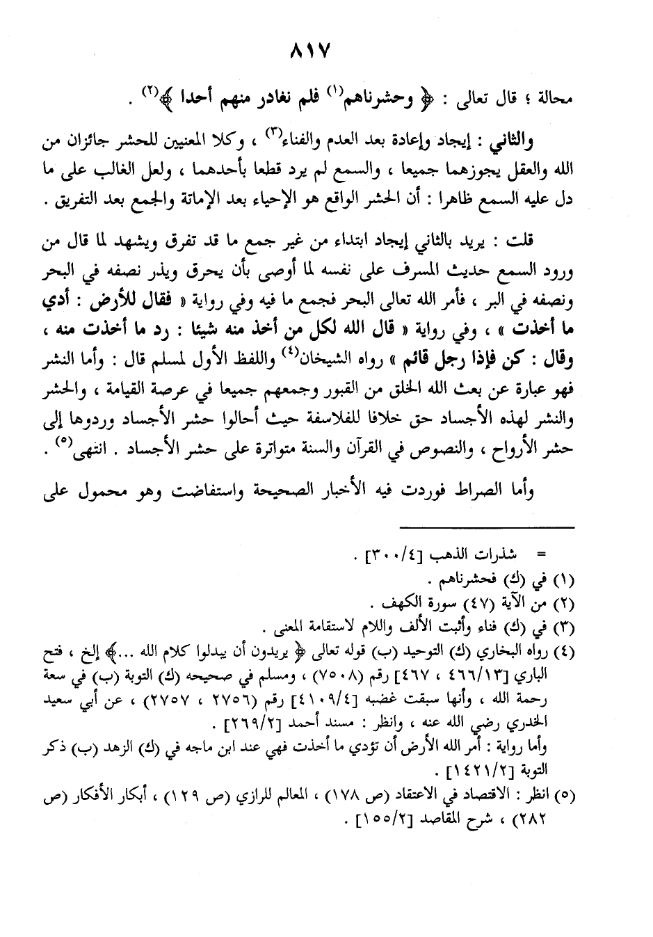 والثاني: إيجاد وإعادة بعد العدم والفناء وكلا المعنيين للحشر جائزان من الله والعقل يجوزهما جميعا، والسمع لم يرد قطعا بأحدهما، ولعل الغالب على ما دل عليه السمع ظاهرا: أن الحشر الواقع هو الإحياء بعد الإماتة والجمع بعد التفريق.