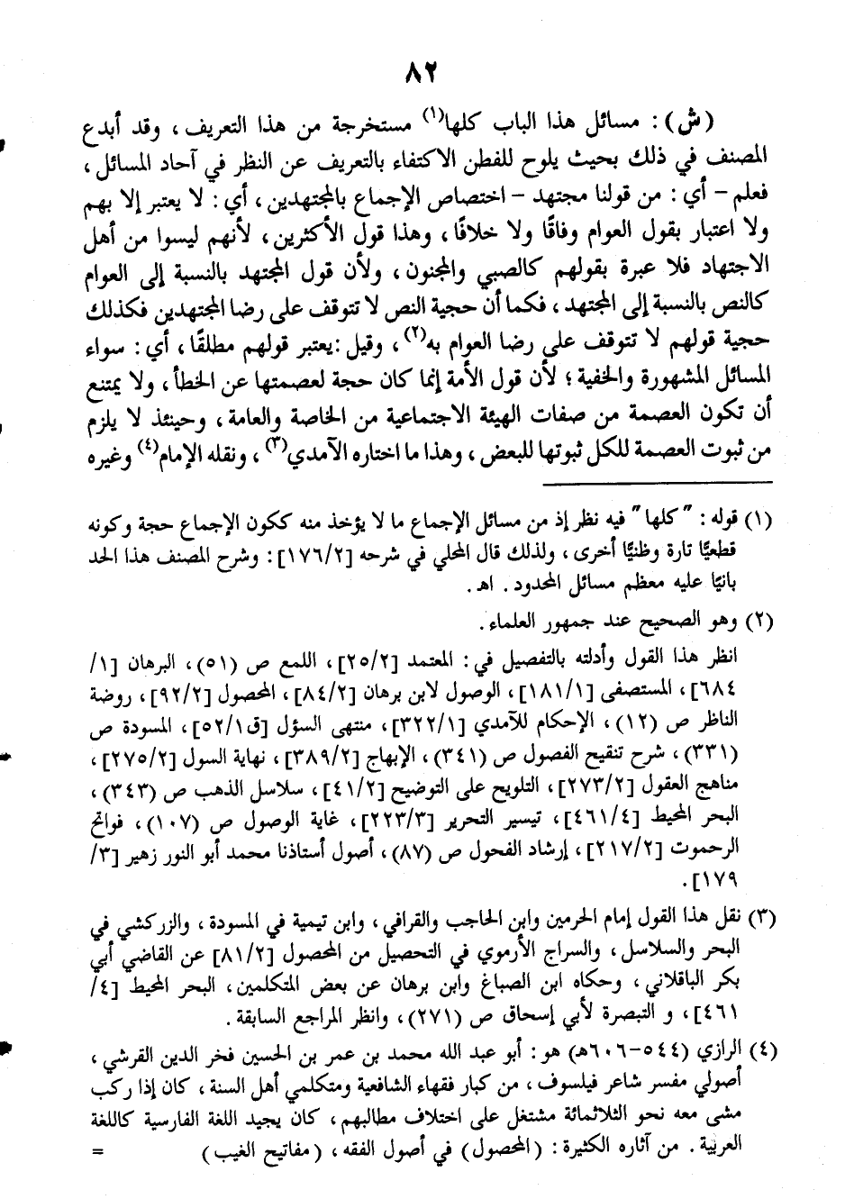 (ش): مسائل هذا الباب كلها مستخرجة من هذا التعريف، وقد أبدع المصنف في ذلك بحيث يلوح للفطن الاكتفاء بالتعريف عن النظر في آحاد المسائل، فعلم ـ أي: من قولنا مجتهد ـ اختصاص الإجماع بالمجتهدين، أي: لا يعتبر إلا بهم ولا اعتبار بقول العوام وفاقاً ولا خلافاً، وهذا قول الأكثرين، لأنهم ليسوا من أهل الاجتهاد فلا عبرة بقولهم كالصبي والمجنون، ولأن قول المجتهد بالنسبة إلى العوام كالنص بالنسبة إلى المجتهد، فكما أن حجية النص لا تتوقف على رضا المجتهدين فكذلك حجية قولهم لا تتوقف على رضا العوام به، وقيل: يعتبر قولهم مطلقاً أي: سواء المسائل المشهورة والخفية لأن قول الأمة إنما كان حجة لعصمتها عن الخطأ، ولا يمتنع أن تكون العصمة من صفات الهيئة الاجتماعية من الخاصة والعامة، وحينئذ لا يلزم من ثبوت العصمة للكل ثبوتها للبعض، وهذا ما اختاره الآمدي، ونقله الإمام وغيره
