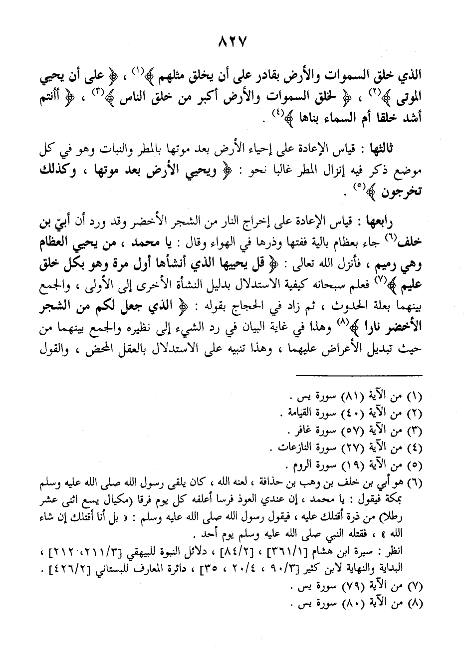 رابعها: قياس الإعادة على إخراج النار من الشجر الأخضر وقد ورد أن أبي بن خلف جاء بعظام بالية ففتها وذرها في الهواء وقال: يا محمد، من يحيي العظام وهي رميم؟، فأنزل الله تعالى: {قل يحييها الذي أنشأها أول مرة وهو بكل خلق عليم} فعلم سبحانه كيفية الاستدلال بدليل النشأة الأخرى إلى الأولى، والجمع بينهما بعلة الحدوث، ثم زاد في الحجاج بقوله: {الذي جعل لكم من الشجر الأخضر نارا} وهذا في غاية البيان في رد الشيء إلى نظيره والجمع بينهما من حيث تبديل الأعراض عليهما، وهذا تنبيه على الاستدلال بالعقل المحض، والقول