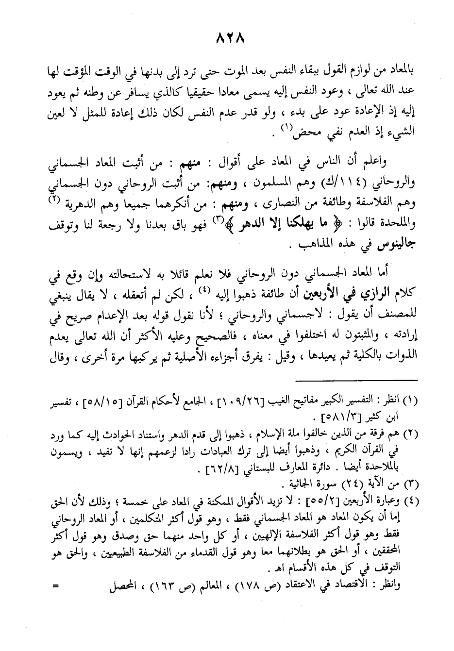واعلم أن الناس في المعاد على أقوال: منهم: من أثبت المعاد الجسماني والروحاني (١١٤/ك) وهم المسلمون: ومنهم: من أثبت الروحاني دون الجسماني وهم الفلاسفة وطائفة من النصارى، ومنهم: من أنكرهما جميعا وهم الدهرية والملحدة قالوا: {ما يهلكنا إلا الدهر} فهو باق بعدنا ولا رجعة لنا وتوقف جالينوس في هذه المذاهب.