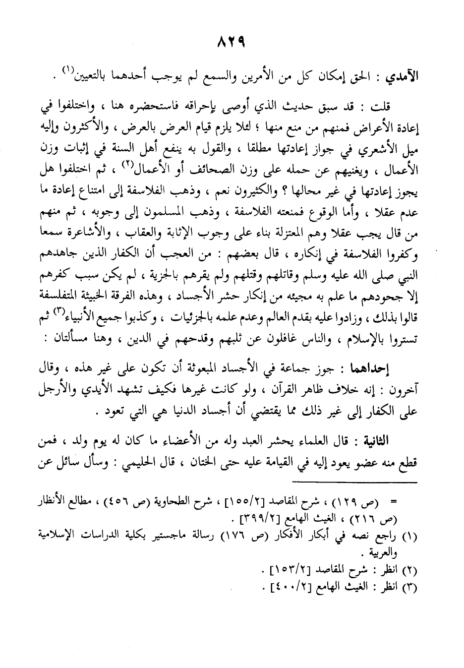 قلت: قد سبق حديث الذي أوصى بإحراقه فاستحضره هنا، واختلفوا في إعادة الأعراض فمنهم من منع منها، لئلا يلزم قيام العرض بالعرض، والأكثرون وإليه ميل الأشعري في جواز إعادتها مطلقا، والقول به ينفع أهل السنة في إثبات وزن الأعمال، ويغنيهم عن حمله على وزن الصحائف أو الأعمال ثم اختلفوا هل يجوز إعادتها في غير محالها؟ والكثيرون نعم، وذهب الفلاسفة إلى امتناع إعادة ما عدم عقلا، وأما الوقوع فمنعته الفلاسفة، وذهب المسلمون إلى وجوبه، ثم منهم من قال يجب عقلا وهم المعتزلة بناء على وجوب الإثابة والعقاب، والأشاعرة سمعا وكفروا الفلاسفة في إنكاره، قال بعضهم: من العجب أن الكفار الذين جاهدهم النبي صلى الله عليه وسلم وقاتلهم وقتلهم ولم يقرهم بالجزية، لم يكن سبب كفرهم إلا جحودهم ما علم به مجيئه من إنكار حشر الأجساد، وهذه الفرقة الخبيثة المتفلسفة قالوا بذلك، وزادوا عليه بقدم العالم وعدم علمه بالجزئيات، وكذبوا جميع الأنبياء ثم تستروا بالإسلام، والناس غافلون عن ثلبهم وقدحهم في الدين، وهنا مسألتان: