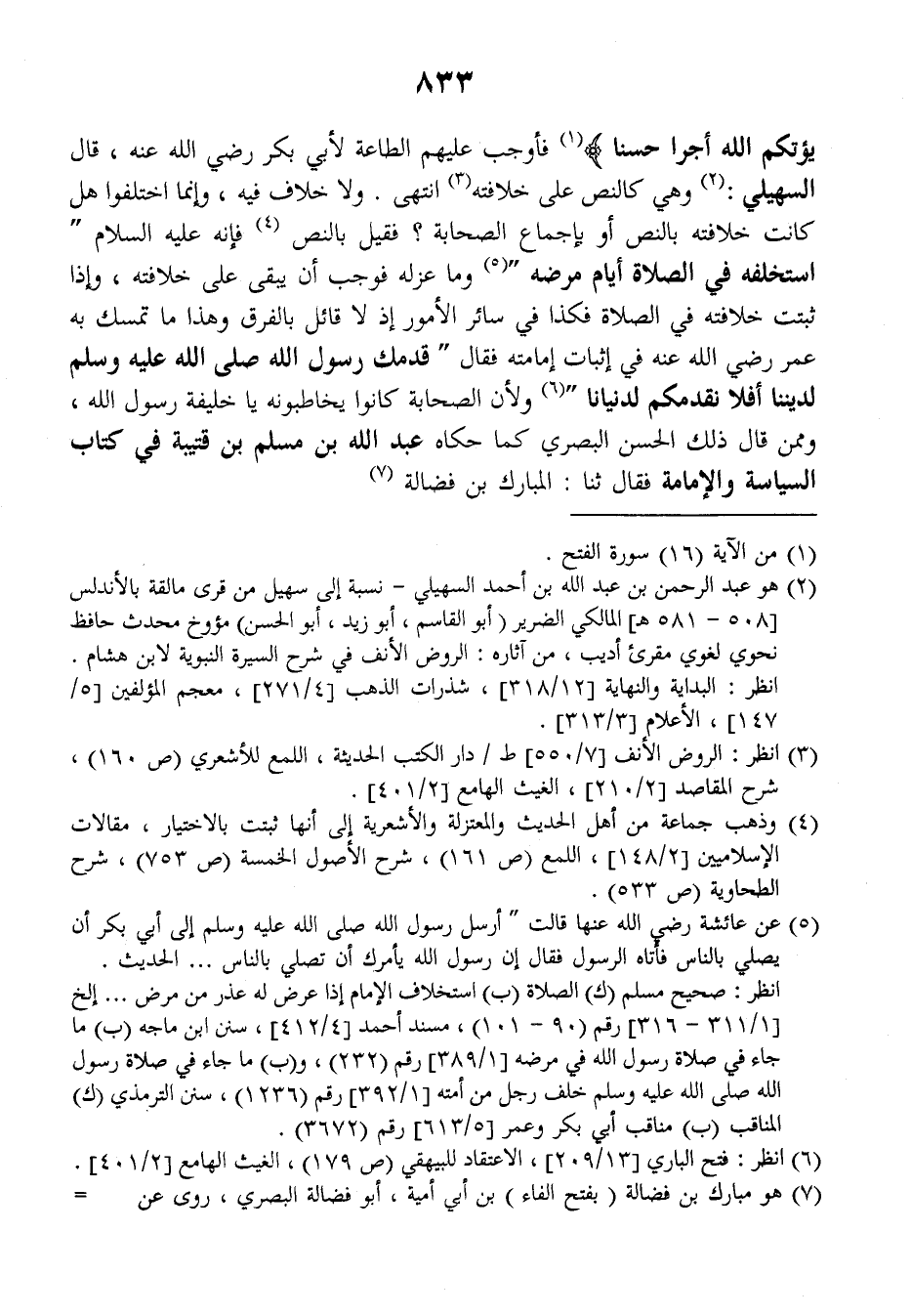 يؤتكم الله أجرا حسنا} فأوجب عليهم الطاعة لأبي بكر رضي الله عنه، قال السهيلي: وهي كالنص على خلافته انتهى. ولا خلاف فيه وإنما اختلفوا هل كانت خلافته بالنص أو بإجماع الصحابة؟ فقيل بالنص، فإنه عليه السلام استخلفه في الصلاة أيام مرضه، وما عزله فوجب أن يبقى على خلافته وإذا ثبتت خلافته في الصلاة فكذا في سائر الأمور إذ لا قائل بالفرق وهذا ما تمسك به عمر رضي الله عنه في إثبات إمامته فقال: (قدمك رسول الله صلى الله عليه وسلم لديننا أفلا نقدمكم= لدنيانا) ولأن الصحابة كانوا يخاطبونه يا خليفة رسول الله وممن قال ذلك الحسن البصري كما حكاه عبد الله بن مسلم بن قتيبة في كتاب (السياسة والإمامة) فقال ثنا: المبارك بن فضالة.