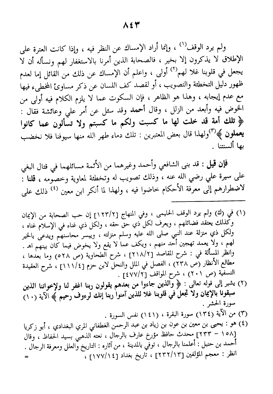 فإن قيل: قد بنى الشافعي وأحمد وغيرهما من الأئمة مسائلهما في قتال البغي على سيرة علي رضي الله عنه وذلك تصويب له وتخطئة لمعاوية وخصومه، قلنا: لاضطرارهم إلى معرفة الأحكام خاضوا فيه، ولهذا لما أنكر ابن معين ذلك على