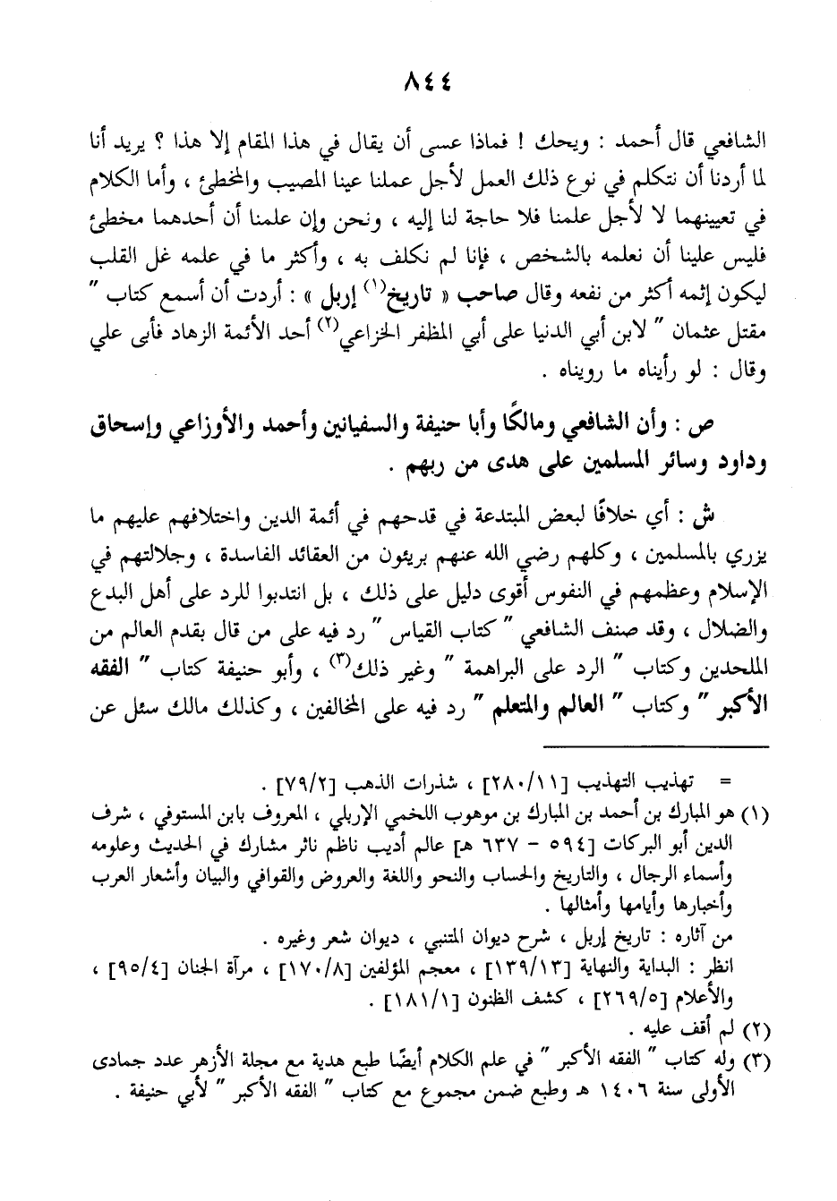 ش: أي خلافا لبعض المبتدعة في قدحهم في أئمة الدين واختلافهم عليهم ما يزري بالمسلمين، وكلهم رضي الله عنهم بريؤون= من العقائد الفاسدة، وجلالتهم في الإسلام وعظمهم في النفوس أقوى دليل على ذلك، بل انتدبوا للرد على أهل البدع والضلال، وقد صنف الشافعي (كتاب القياس) رد فيه على من قال بقدم العالم من الملحدين وكتاب (الرد على البراهمة) وغير ذلك، وأبو حنيفة كتاب (الفقه الأكبر) وكتاب (العالم والمتعلم) رد فيه على المخالفين، وكذلك مالك سئل عن