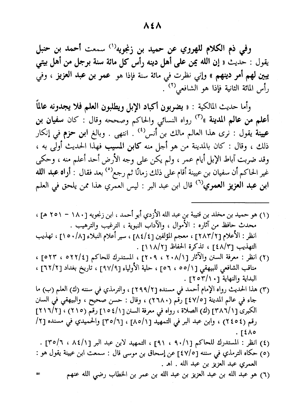 وفي (ذم الكلام) للهروي عن حميد بن زنجويه سمعت أحمد بن حنبل يقول: حديث ((إن الله يمن على أهل دينه رأس كل مائة برجل من أهل بيتي يبين لهم أمر دينهم)) وإني نظرت في مائة سنة فإذا هو عمر بن عبد العزيز، وفي رأس المائة الثانية فإذا هو الشافعي.