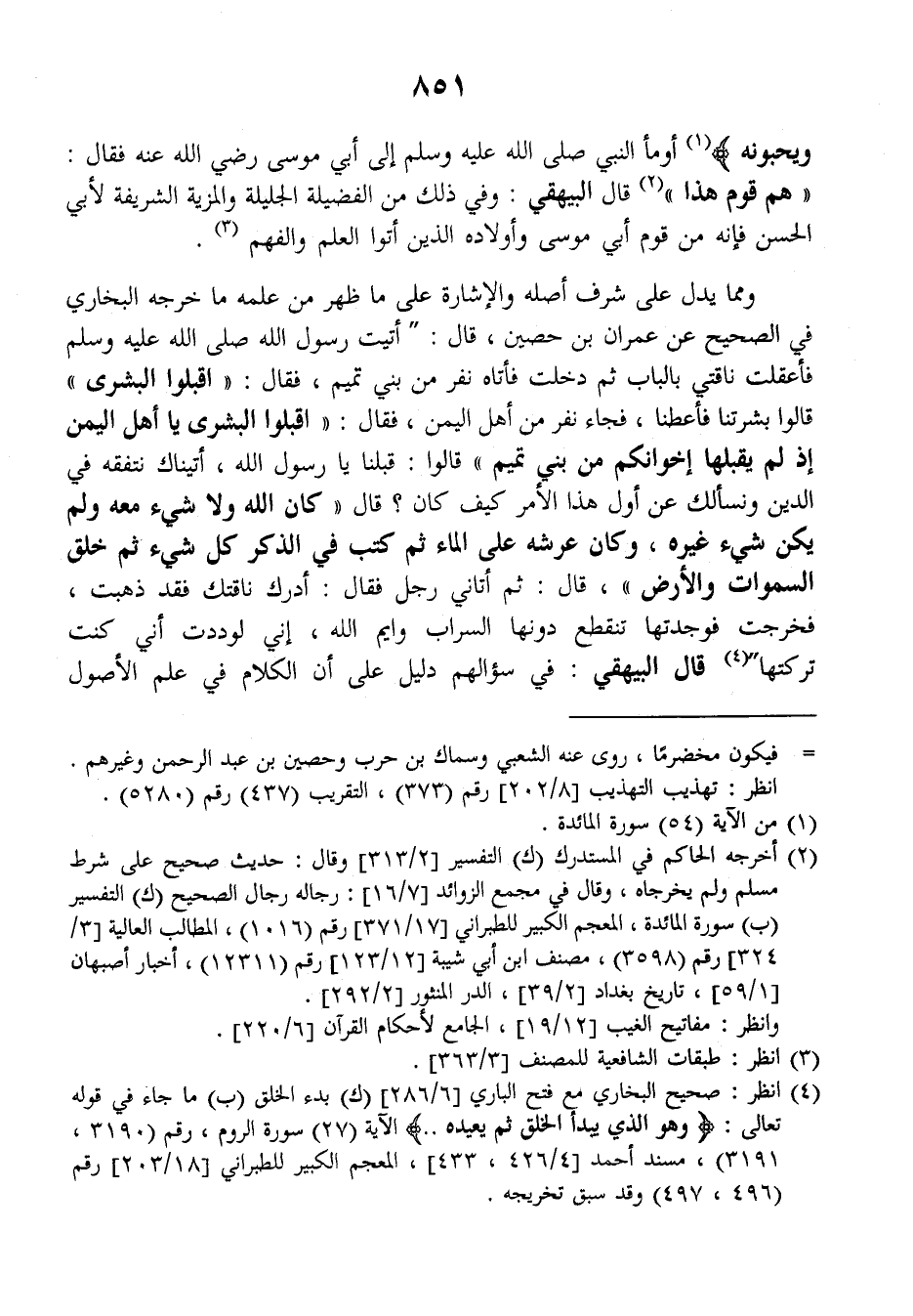 ومما يدل على شرف أصله والإشارة على ما ظهر من علمه ما خرجه البخاري في الصحيح عن عمران بن حصين، قال: (أتيت رسول الله صلى الله عليه وسلم فأعقلت ناقتي بالباب ثم دخلت فأتاه نفر من بني تميم، فقال: ((اقبلوا البشرى)) قالوا بشرتنا فأعطنا، فجاء نفر من أهل اليمن، فقال: ((اقبلوا البشرى يا أهل اليمن إذ لم يقبلها إخوانكم من بني تميم)) قالوا: قبلنا يا رسول الله أتيناك نتفقه في الدين ونسألك عن أول هذا الأمر كيف كان؟ قال: ((كان الله ولا شيء معه ولم يكن شيء غيره وكان عرشه على الماء ثم كتب في الذكر كل شيء ثم خلق السماوات والأرض)) قال: ثم أتاني رجل فقال: أدرك ناقتك فقد ذهبت، فخرجت فوجدتها تنقطع دونها السراب وايم الله، إني لوددت أني كنت تركتها قال البيهقي: في سؤالهم دليل على أن الكلام في علم الأصول