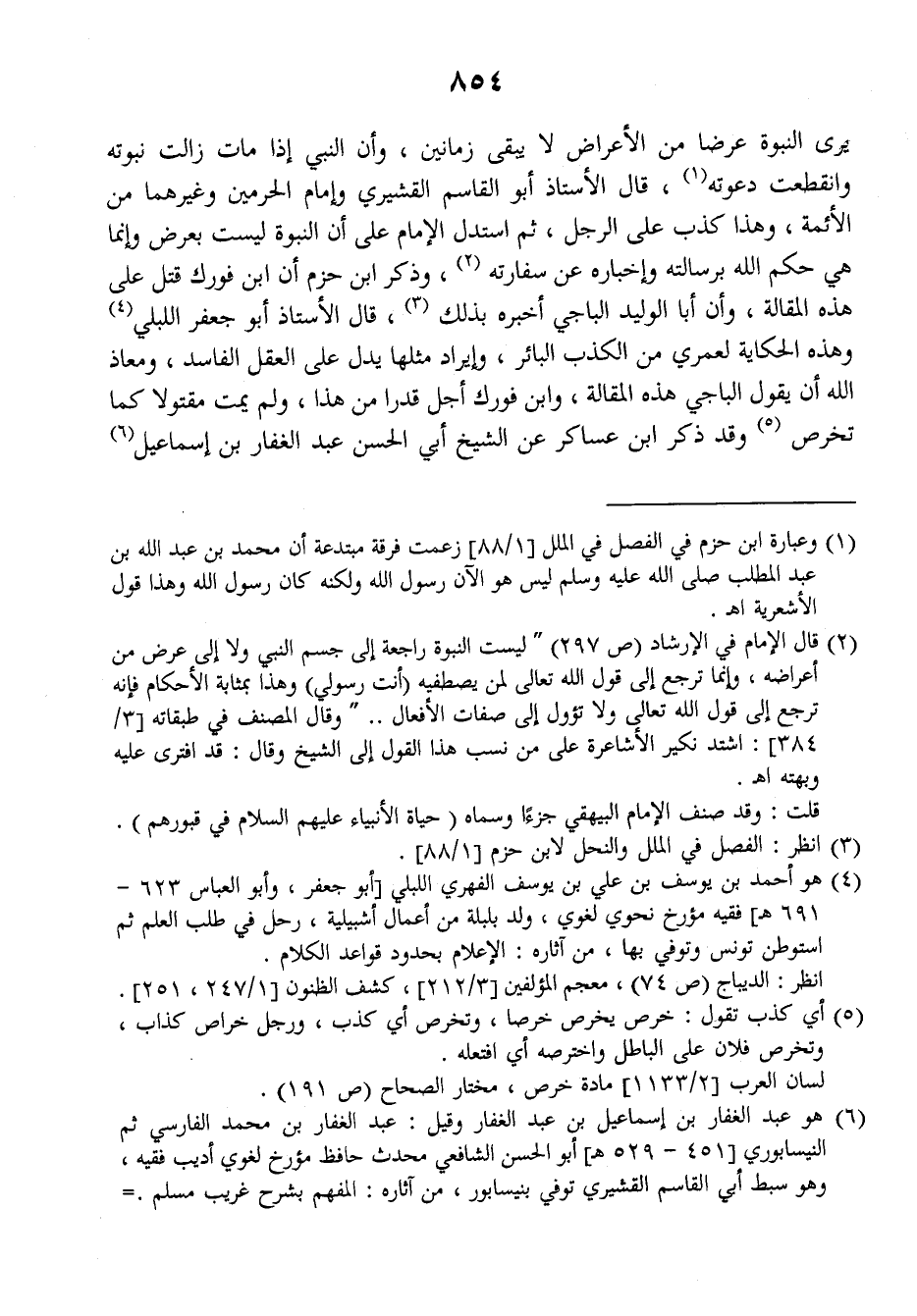 يرى النبوة عرضا من الأعراض لا يبقى زمانين، وأن النبي إذا مات زالت نبوته وانقطعت دعوته قال الأستاذ أبو القاسم القشيري وإمام الحرمين وغيرهما من الأئمة، وهذا كذب على الرجل، ثم استدل الإمام على أن النبوة ليست بعرض وإنما هي حكم الله برسالته وإخباره عن سفارته وذكر ابن حزم أن ابن فورك قتل على هذه المقالة، وأن