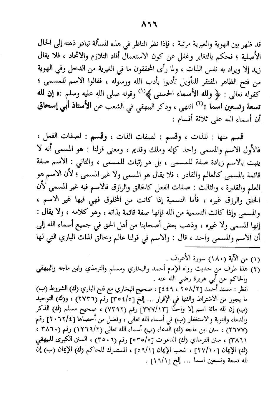 نظر الناظر في هذه المسألة تبادر ذهنه إلى الحال الأصلية، فحكم بالتغاير وغفل عن كون الاستعمال أفاد التلازم والاتحاد، فلا يقال زيد إلا ويراد به نفس الذات، ولما رأى المحققون ما في الغيرية من الدخل وفي الهوية من فتح الظاهر المفتقر للتأويل تأدبوا بأدب الله ورسوله، فقالوا الاسم للمسمى، كقوله تعالى: {ولله الأسماء الحسنى} وقوله صلى الله عليه وسلم: ((إن لله تسعة وتسعين اسما)) انتهى. وذكر البيهقي في (الشعب) عن الأستاذ أبي إسحاق أن أسماء الله على ثلاثة أقسام: