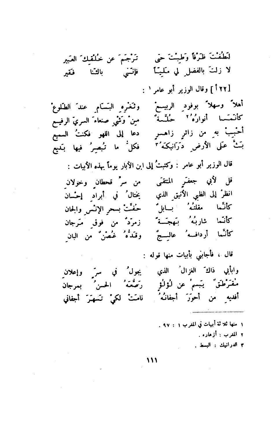 بث على الأرض درانيكه ... فكل ما تبصر فيها بديع قال الوزير أبو عامر: وكتبت إلى ابن الأبار يوما بهذه الأبيات: