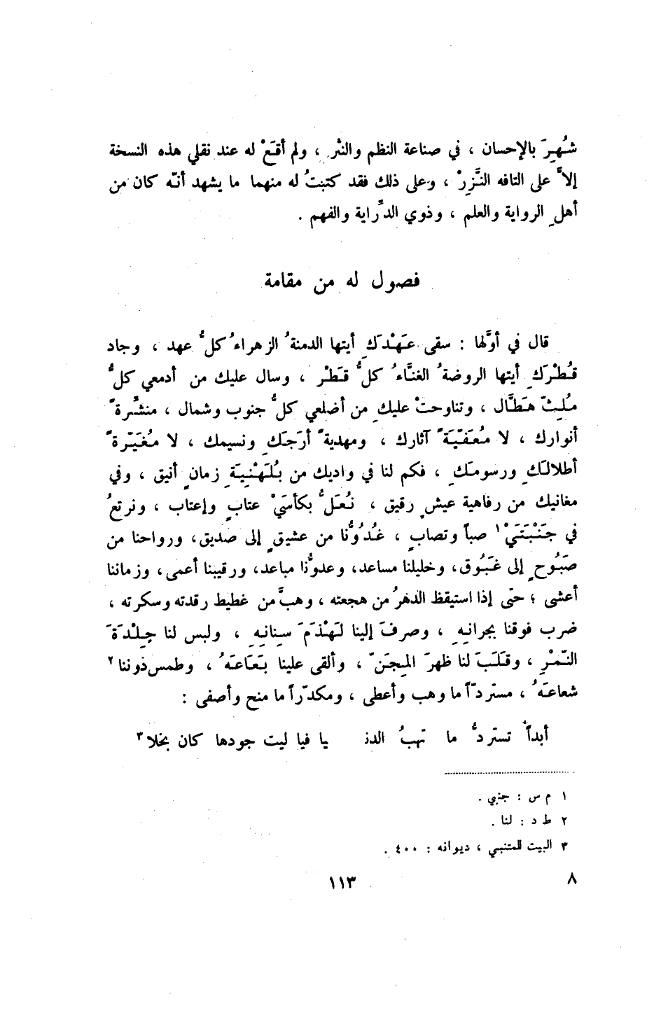 شهر بالإحسان، في صناعة النظم والنثر، ولم أقع له عند نقلي هذه النسخة إلا على التافه النزر، وعلى ذلك فقد كتبت له منهما ما يشهد أنه كان من أهل الرواية والعلم، وذوي الدراية والفهم.