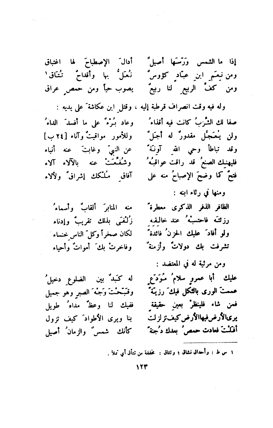 ومن كف الربيع لنا ربيع ... يصوب حيا ومن حمص عراق وله فيه وقت انصراف قرطبة إليه، وقتل ابن عكاشة على يديه: