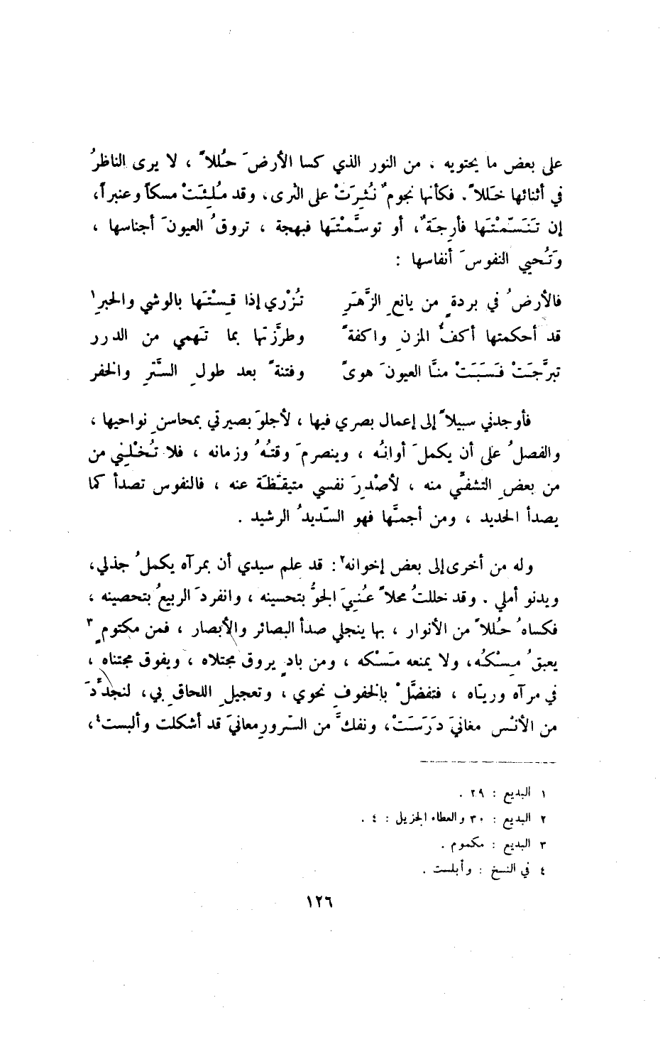على بعض ما يحتويه، من النور الذي كسا الأرض حللا، لا يرى الناظر في أثنائها خللا، فكأنها نجوم نثرت على الثرى، وقد ملئت مسكا وعنبرا، إن تنسمتها فأرجة، أو توسمتها فبهجة، تروق العيون أجناسها، وتحيي النفوس أنفاسها: