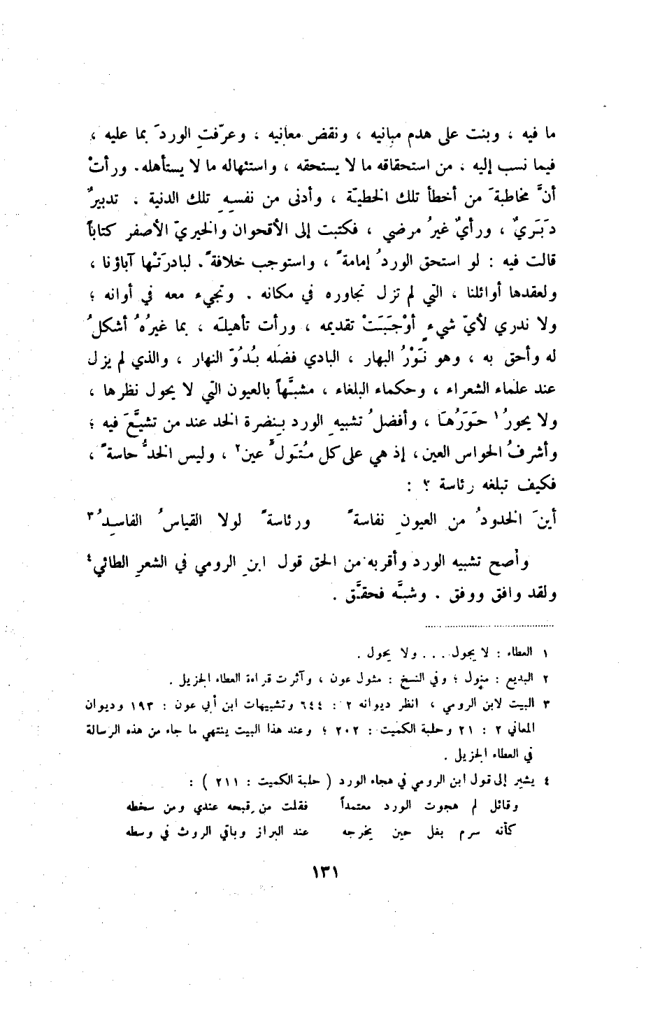 أين الخدود من العيون نفاسة ... ورئاسة لولا القياس الفاسد وأصح تشبيه الورد وأقربه من الحق قول ابن الرومي في الشعر الطائي ولقد وافق ووفق، وشبه فحقق.