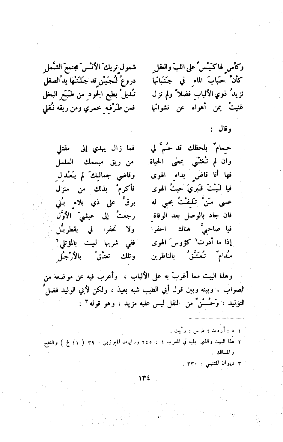 مدام تعتق بالناظرين ... وتلك تعتق بالأرجل وهذا البيت مما أغرب به على الألباب، وأعرب فيه عن موضعه من الصواب، وبينه وبين قول أبي الطيب شبه بعيد، ولكن لأبي الوليد فضل التوليد، وحسن من النقل ليس عليه مزيد، وهو قوله: