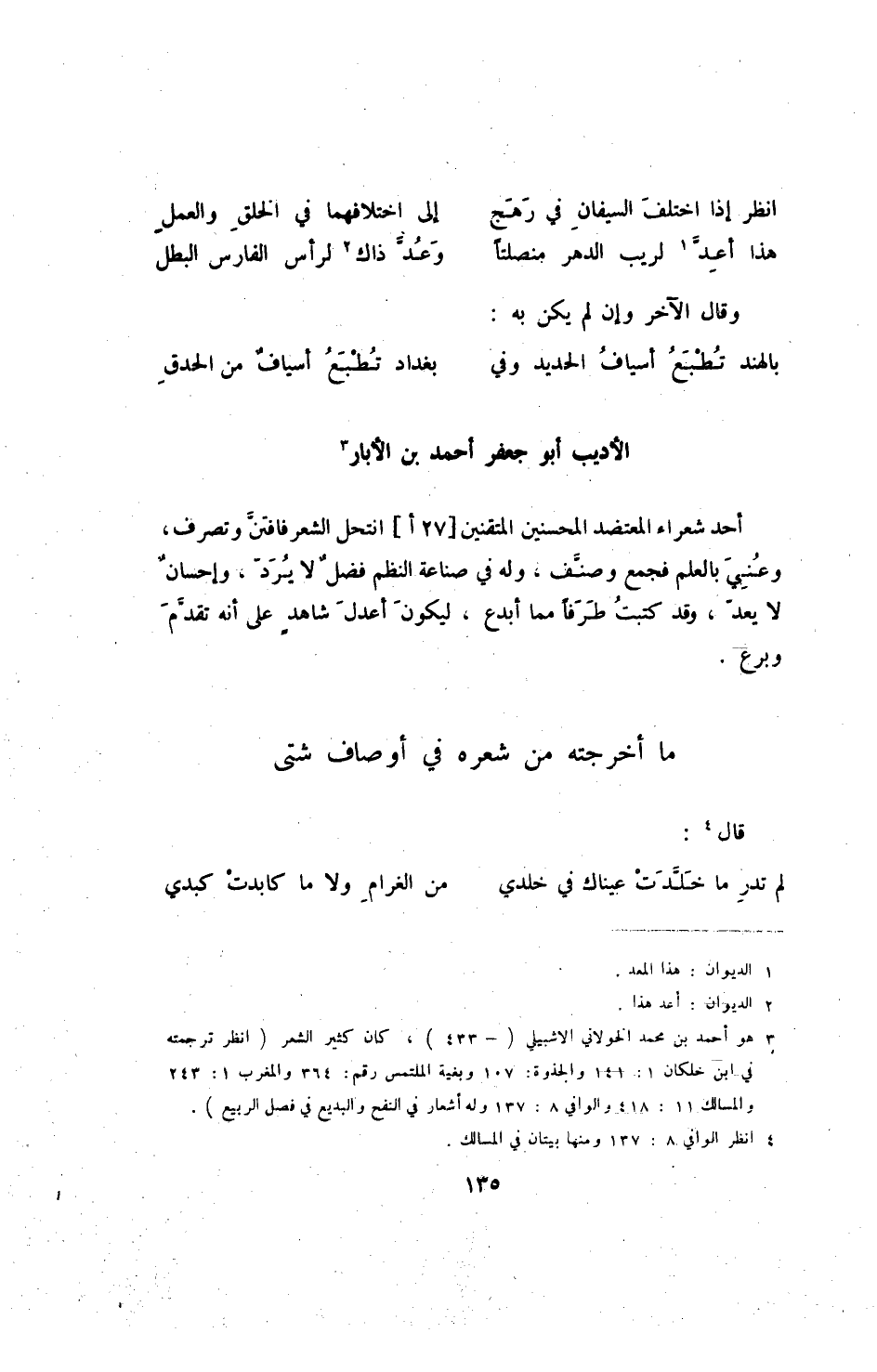 بالهند تطبع أسياف الحديد وفي ... بغداد تطبع أسياف من الحدق الأديب أبو جعفر أحمد بن الأبار