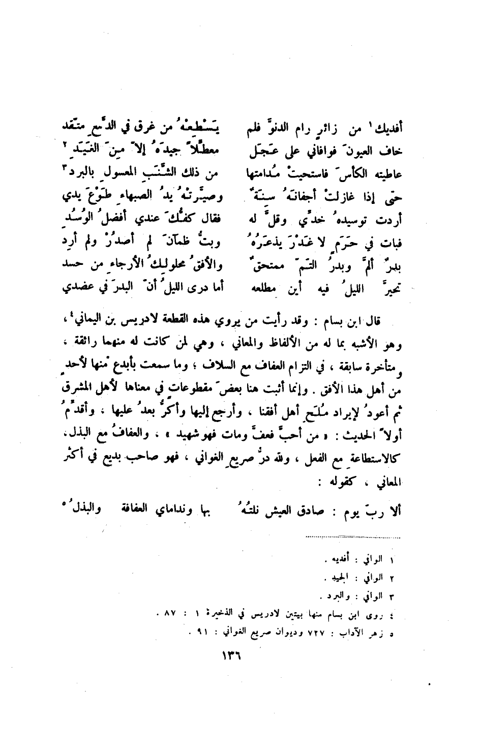 تحير الليل فيه أين مطلعه ... أما درى الليل أن البدر في عضدي قال ابن بسام: وقد رأيت من يروي هذه القطعة لإدريس بن اليماني، وهو الأشبه بما له من الألفاظ والمعاني، وهي لمن كانت له منهما رائقة، ومتأخرة سابقة، في التزام العفاف مع السلاف؛ وما سمعت بأبدع منها لأحد من أهل هذا الأفق. وإنما أثبت هنا بعض مقطوعات في معناها لأهل المشرق ثم أعود لإيراد ملح أهل أفقنا، وأرجع إليها وأكر بعد عليها، وأقدم أولا الحديث: " من أحب فعف ومات فهو شهيد "، والعفاف مع البذل، كالاستطاعة مع الفعل، ولله در صريع الغواني، فهو صاحب بديع في أكثر المعاني، كقوله: