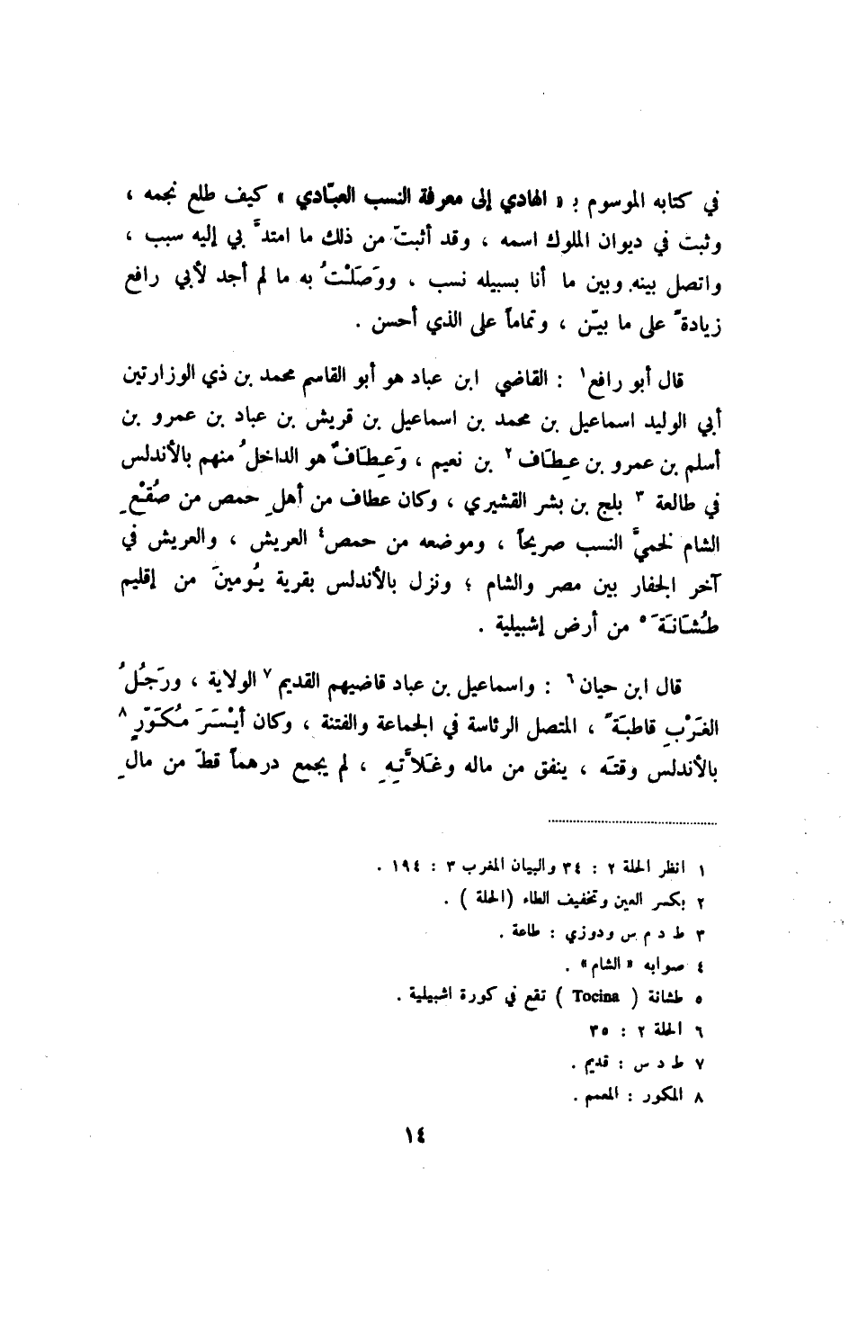 في كتابه الموسوم ب - " الهادي إلى معرفة النسب العبادي " كيف طلع نجمه، وثبت في ديوان الملوك اسمه، وقد أثبت من ذلك ما امتد بي إليه سبب، واتصل بينه وبين ما أنا بسبيله نسب، ووصلت به ما لم أجد لأبي رافع زيادة على ما بين، وتماماً على الذي أحسن.