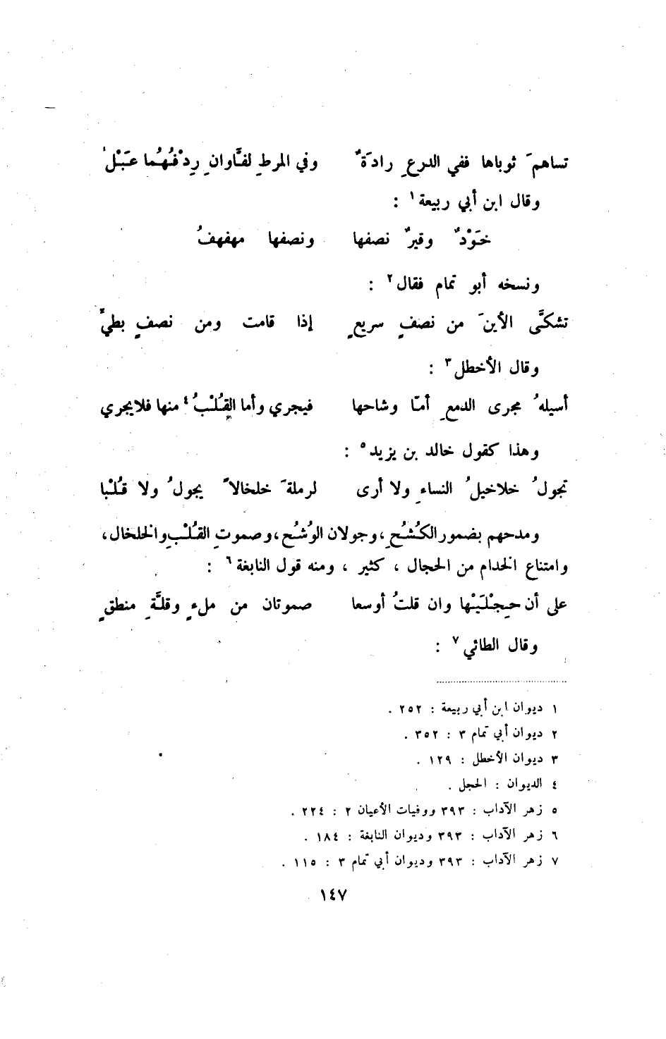 تجول خلاخيل النساء ولا أرى ... لرملة خلخالا يجول ولا قلبا ومدحهم بضمور الكشح، وجولان الوشح، وصموت القلب والخلخال، وامتناع الخدام من الحجال، كثير، ومنه قول النابغة: