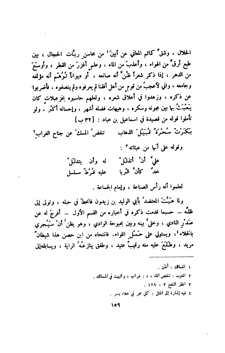 الحلال، وشق كمائم المعاني عن أبين من محاسن ربات الحجال، بين طبع أرق من الهواء، وأعذب من الماء، وعلمٍ أغزر من القطر، وأوسع من الدهر، إذا ذكر شعراً ظن أنه صانعه، أو ديواناً توهم أنه مؤلفه وجامعه واني لأعجب من قومٍ من أهل أفقنا لم يعرفوه ولم ينضفوه، فأضربوا عن ذكره، وزهدوا في أعلاق شعره، ولعلهم حاسبوه بخزعبلاتٍ كان يعبث بها بين مجونه وسكره، وهيهات فضله أشهر، وإحسانه أكثر، ولو تأملوا قوله من قصيدة في إسماعيل بن عباد: [32ب]