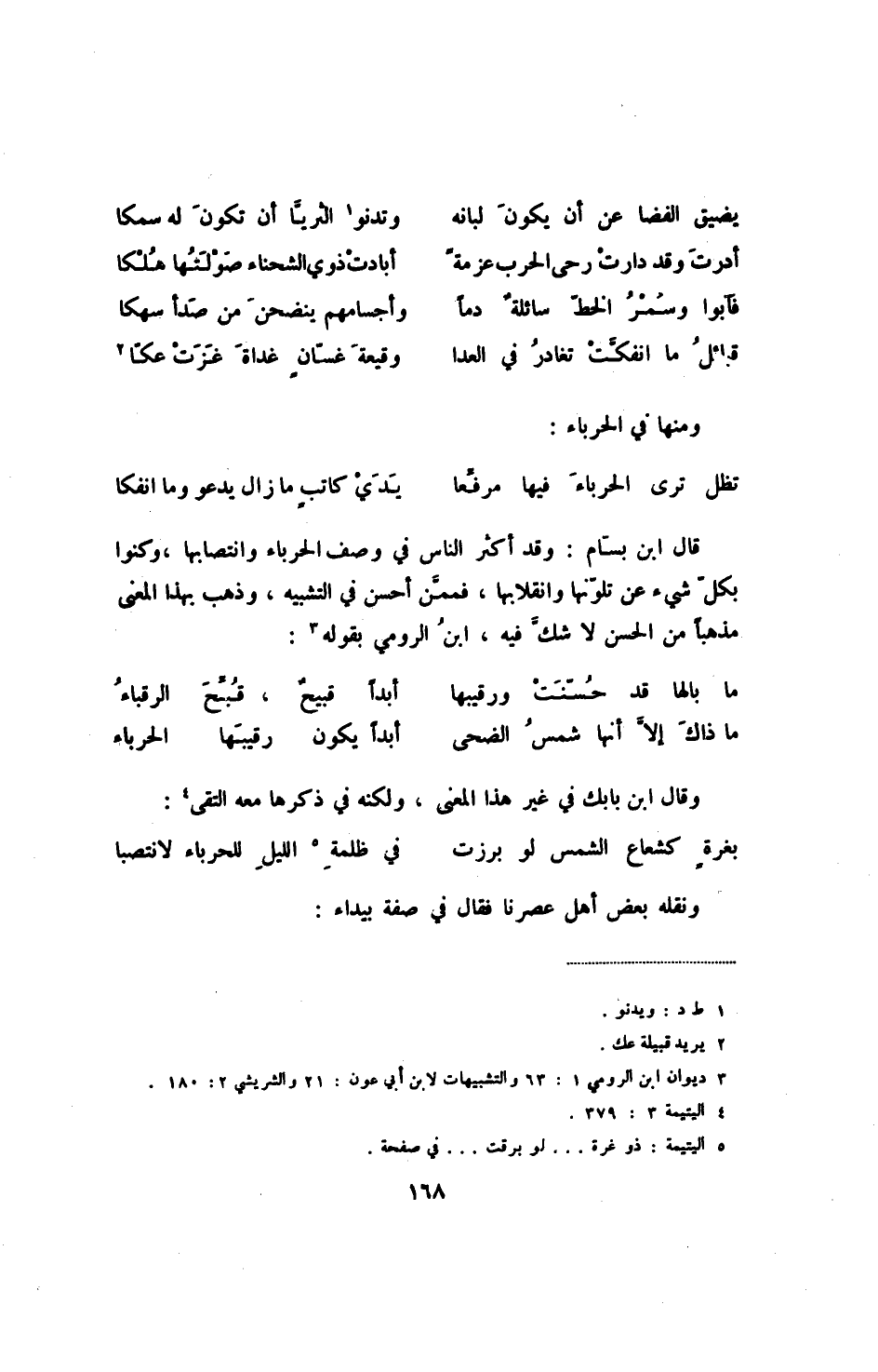 تظل ترى الحرباء فيها مرفعا ... يدي كاتب ما زال يدعو وما انفكا قال ابن بسام: وقد أكثر الناس في وصف الحرباء وانتصابها، وكنوا بكل شيء عن تلونها وانقلابها، فممن أحسن في التشبيه، وذهب بهذا المعنى مذهبا من الحسن لا شك فيه، ابن الرومي بقوله: