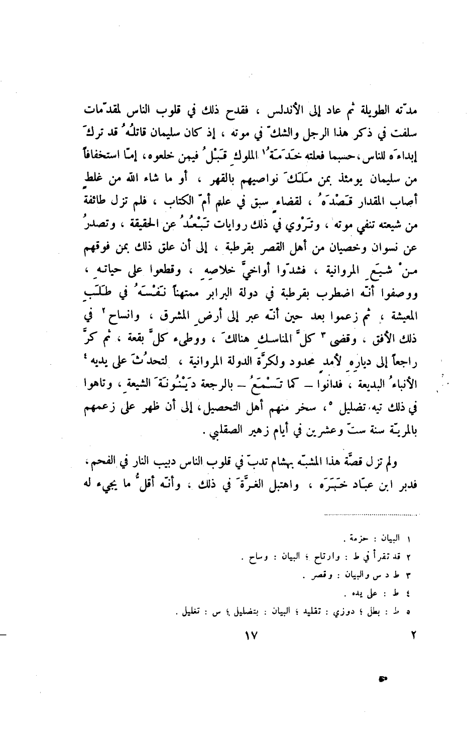 مدته الطويلة ثم عاد إلى الأندلس، فقدح ذلك في قلوب الناس لمقدمات سلفت في ذكر هذا الرجل والشك في موته، إذ كان سليمان قاتله قد ترك إبداءه للناس، حسبما فعلته خدمة الملوك قبل فيمن خلعوه، إما استخفافاً من سليمان يومئذ بمن ملك نواصيهم بالقهر، أو ما شاء الله من غلط أصاب المقدار قصده، لقضاء سبق في علم أم الكتاب، فلم تزل طائفة من شيعته تنفي موته، وتروي في ذلك روايات تبعد عن الحقيقة، وتصدر عن نسوان وخصيان من أهل القصر بقرطبة، إلى أن علق ذلك بمن فوقهم من شيع المروانية، فشدوا أواخي خلاصه، وقطعوا على حياته، ووصفوا أنه اضطرب بقرطبة في دولة البرابر ممتهنا نفسه في طلب المعيشة، ثم زعموا بعد حين أنه عبر إلى أرض المشرق، وانساح في ذلك الأفق، وقضى كل المناسك هنالك، ووطئ كل بقعة، ثم كر راجعاً إلى دياره لأمد محدود ولكرة الدولة المروانية، لتحدث على يديه الأنباء البديعة، فدانوا - كما تسمع - بالرجعة دينونة الشيعة، وتاهوا في ذلك تيه تضليل، سخر منهم أهل التحصيل، إلى أن ظهر على زعمهم بالمرية سنة ست وعشرين في أيام زهير الصقلبي.