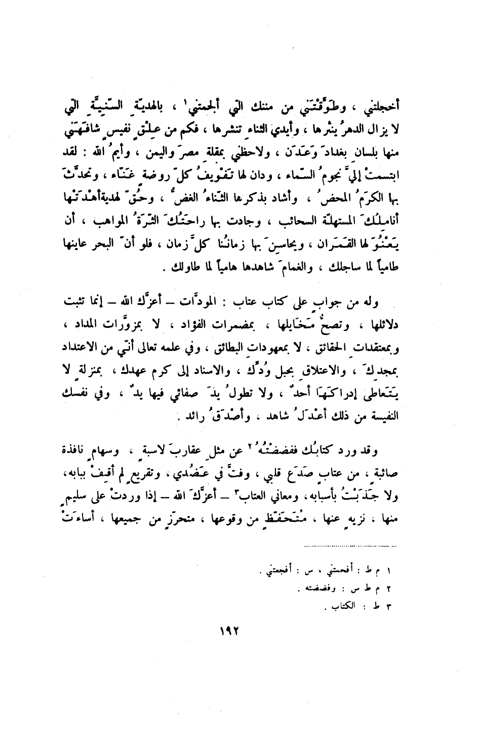 أخجلتني، وطوقتني من مننك التي ألجمتني، بالهدية السنية التي لا يزال الدهر ينثرها، وأيدي الثناء تنشرها، فكم من علقٍ نفيسٍ شافهني منها بلسان إلي نجوم السماء، ودان لها تفويت كل روضة غناء، وتحدث بها الكرم المحض، وأشاد بذكرها الثناء الغض، وحق لهدية أهداتها أناملك المستهلة السحائب، وجادت بها راحتك الثرة المواهب، أن يعنو لها القمران، ويحاسن بها زماننا كل زمان، فلو أن البحر عاينها طامياً لما ساجلك، والغمام شاهدها هامياً لاما طاولك.