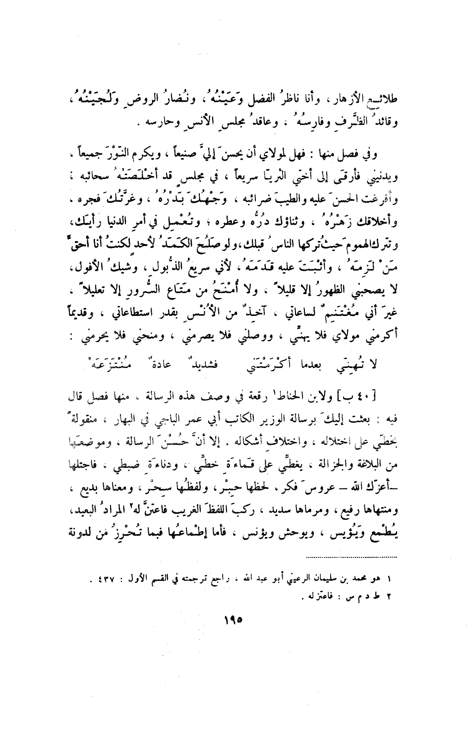 وفي فصل منها: فهل لمولاي أن يحسن إليّ صنيعاً، ويكرم النور جميعاً، ويدنيني فأرقى إلى أختي الثريا سريعاً، في مجلس قد أخلصته سحائبه، وأفرغت الحسن عليه والطيب ضرائبه، وجهك بدره، وغرتك فجره، وأخلاقك زهره، وثناؤك دره وعطره؛ وتعمل في أمر الدنيا رأيك، وتترك الهموم حيث تركها الناس قبلك، ولو صلح الكمد لأحد لكنت أنا أحق من لزمه، وأثبت عليه قدمه، لأني سريع الذبول، وشيك الأفول، لا يصحبني الظهور إلا قليلاً، ولا أمنح من متاع السرور إلا تعليلاً، غير أني مغتنم لساعاتي، آخذ من الأنس بقدر استطاعاتي، وقديماً أكرمني مولاي فلا يهني، ووصلني فلا يصرمني، ومنحني فلا يحرمني: