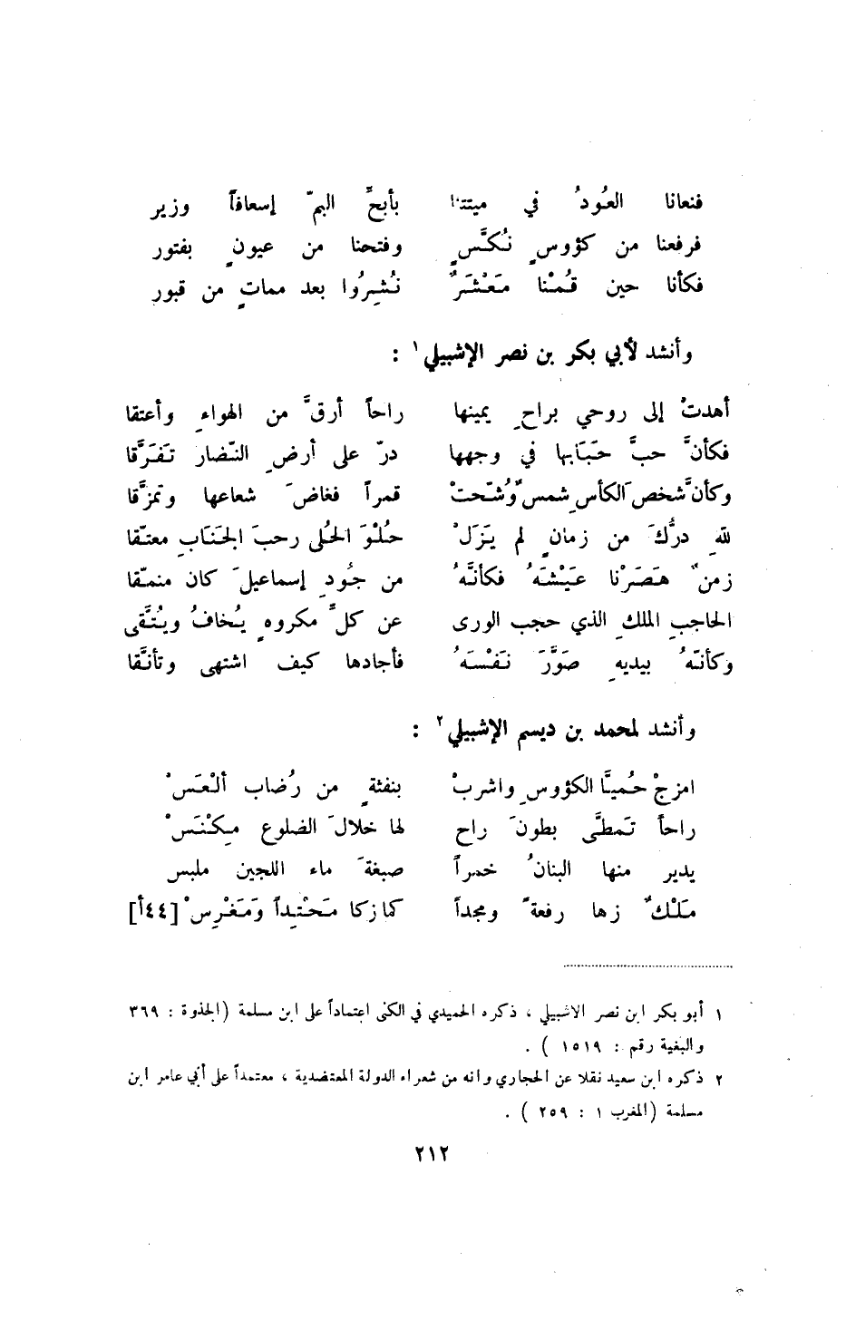 فكأن حين قمنا معشر ... نشروا بعد مماتٍ من قبور وأنشد لأبي بكر بن نصر الإشبيلي: