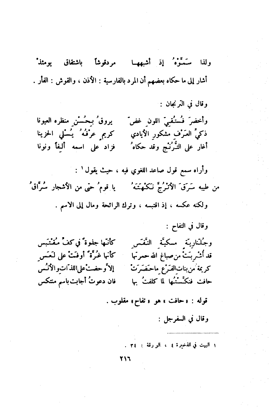 حافت فنكستها لما كلفت بها ... فإن دعوت أجابت باسم منتكس قوله: " حافت " هو " تفاح " مقلوب.