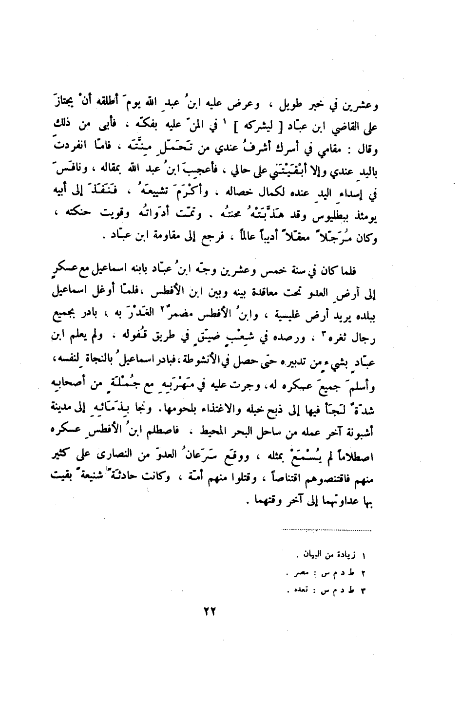 وعشرين في خبر طويل، وعرض عليه ابن عبد الله يوم أطلقه أن يجتاز على القاضي ابن عباد [ليشركه] في المن عليه بفكه، فأبى من ذلك وقال: مقامي في أسرك أشرف عندي من تحمل منته، فأما انفردت باليد عندي وإلا أبقتني على حالي، فأعجب ابن عبد الله بمقاله، ونافس في إسداء اليد عنده لكمال خصاله، وأكرم تشييعه، فنفذ إلى أبيه يومئذ ببطليوس وقد هذبته محنتهن وتمت أدواته وقويت حنكته، وكان مرجلاً معقلاً أديباً عالماً، فرجع إلى مقاومة ابن عباد.