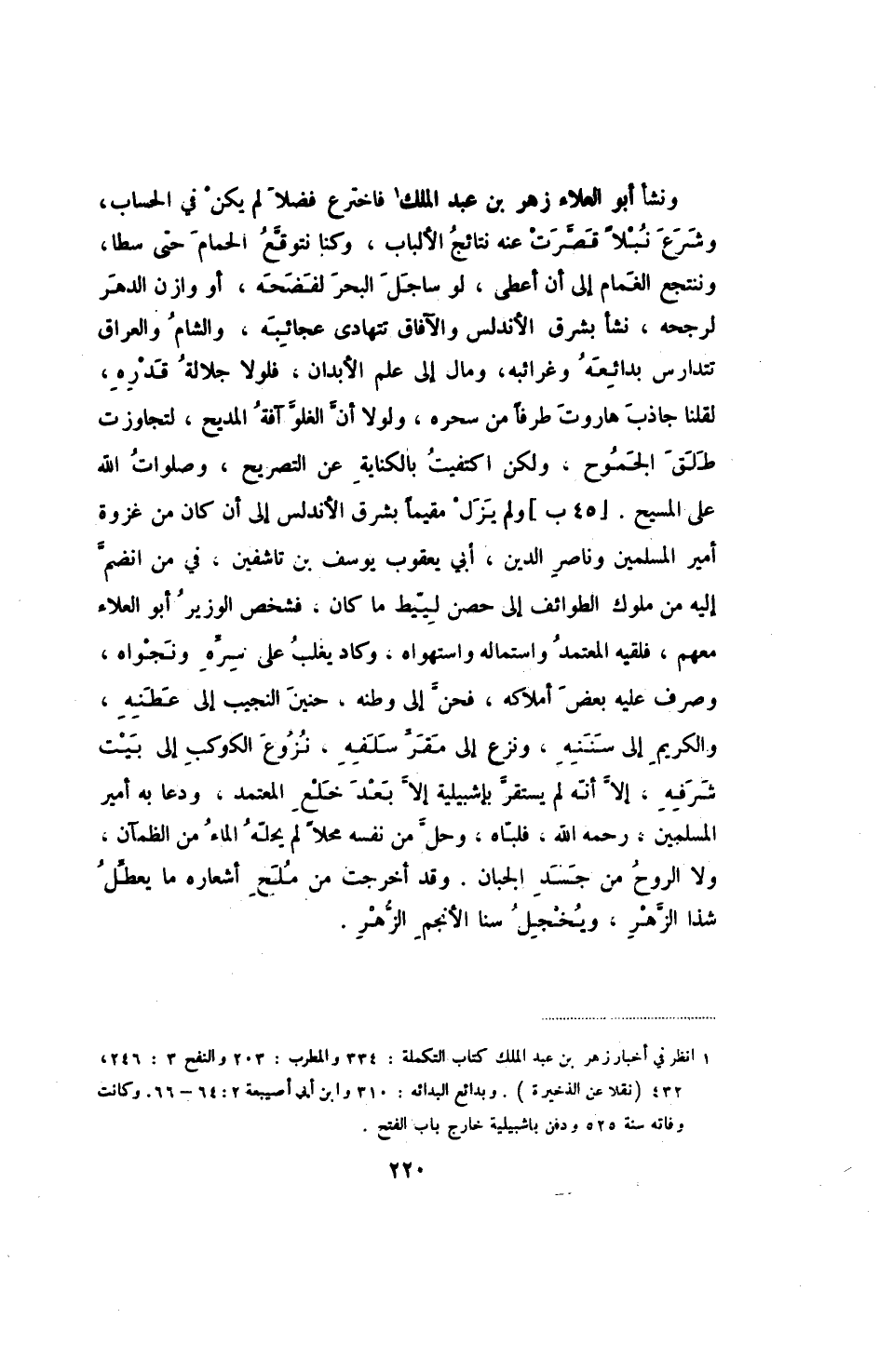 ونشأ أبو العلاء زهر بن عبد الملك فاخترع فضلاً لم يكن في الحساب، وشرع نبلاً قصرت عنه نتائج الألباب، وكنا نتوقع الحمام حتى سطا، وننتجع الغمام إلى أن أعطى، لو ساجل البحر لفضحه، أو وازن الدهر لرجحه، نشأ بشرق الأندلس والآفاق تتهادى عجائبه، والشام والعراق تتدارس بدائعه وغرائبه، ومال إلى علم الأبدان، فلولا جلالة قدره، لقلنا جاذب هاروت طرفاً من سحره، ولولا أن الغلو آفة المديح، لتجاوزت طلق الجموح، ولكن اكتفيت بالكناية عن التصريح، وصلوات الله على المسيح. [45ب] ولم يزل مقيماً بشرق الأندلس إلى أن كان من غزوة أمير المسلمين وناصر الدين، أبي يعقوب يوسف بن تاشفين، في من انضم إليه من ملوك الطوائ إلى حصن لييط ما كان، فشخص الوزير أبو العلاء معهم، فلقيه المعتمد واستماله واستهواه، وكاد يغلب على سره ونجواه، وصرف عليه بعض أملاكه، فحن إلى وطنه، حنين النجيب إلى عطنه، والكريم إلى سننه، ونزع إلى مقر سلفه، نزوع الكوكب إلى بيت شرفه، إلا أنه لم يستقر بإشبيلية إلا بعد خلع المعتمد، ودعا به أمير المسلمين، رحمه الله، فلباه، وحل من نفسه محلاً لم يحله الماء من الظمآن، ولا الروح من جسد الجبان، وقد أخرجت من ملح أشعاره ما يعطل شذا الزهر، ويخجل سنا الأنجم الزهر.