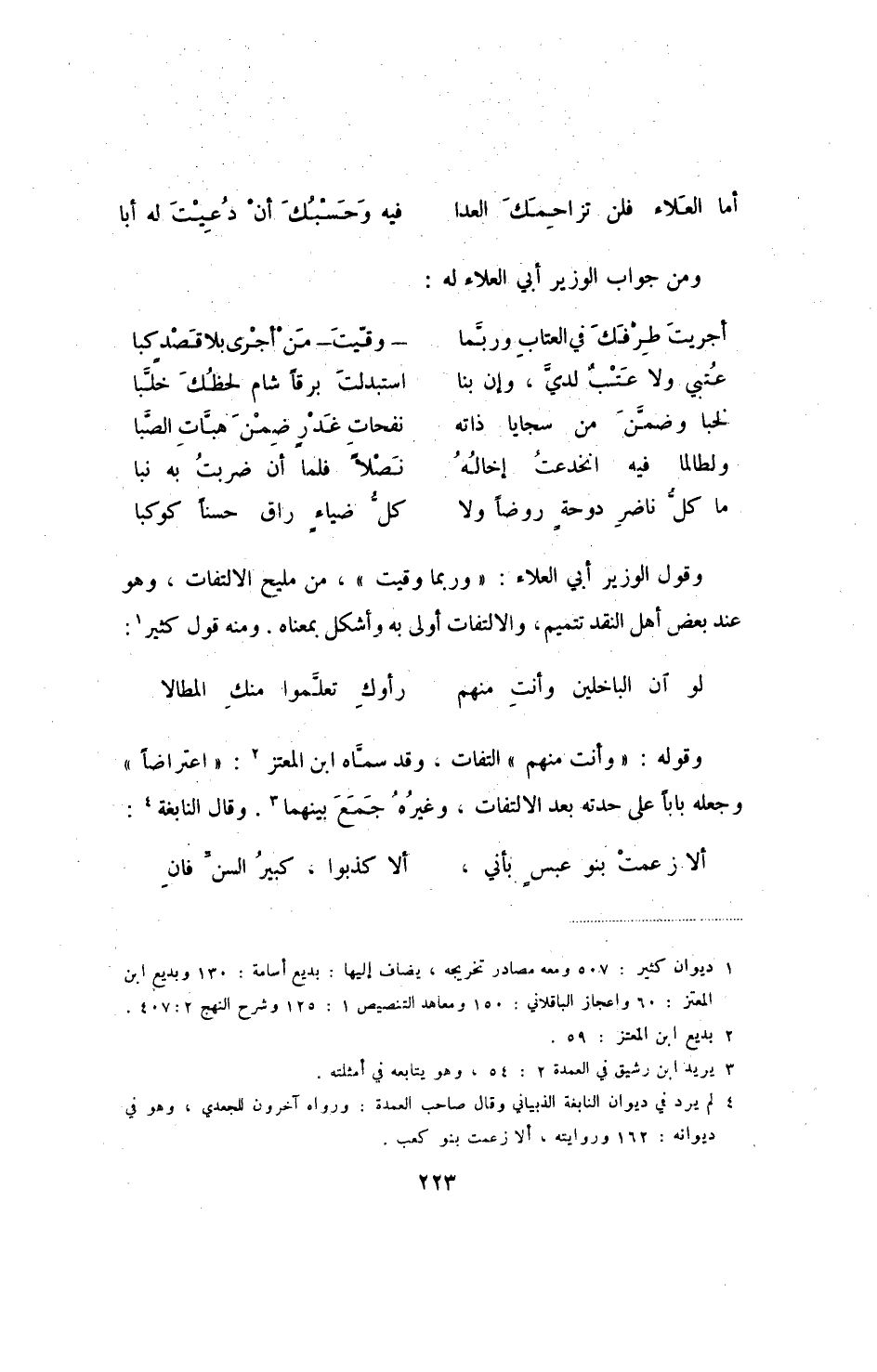 ما كل ناضر دوحةٍ روضاً ولا ... كل ضياء راق حسناً كوكباً وقول الوزير أبي العلاء: " وربما وقيت "، من مليح الالتفات، وهو عند بعض أهل النقد تتميم، والالتفات أول به وأشك بمعناه، ومنه قول كثير: