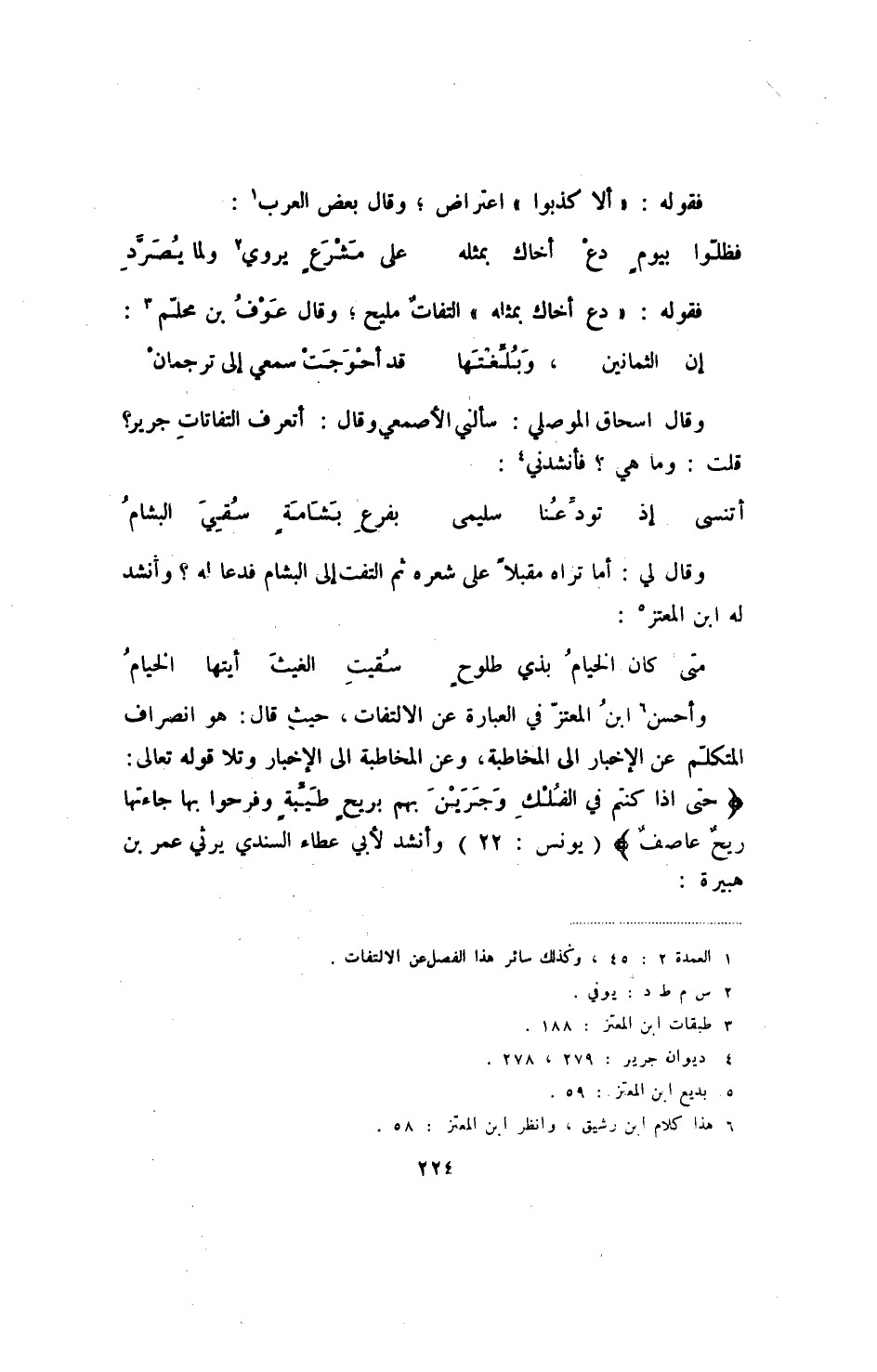 متى كان الخيام بذي طلوحٍ ... سقيت الغيث أيتها الخيام وأحسن ابن المعتز في العبارة عن الالتفات، حيث قال: هو انصراف المتكلم عن الإخبار إلى المخاطبة، وعن المخاطبة إلى الإخبار وتلا قوله تعالى: {حتى إذا كنتم في الفلك وجرين بهم بريحٍ طيبةٍ وفرحوا بها جاءتها ريح عاصف} (يونس: 22) وأنشد لأبي عطاء السندي يرثي عمر بن هبيرة: