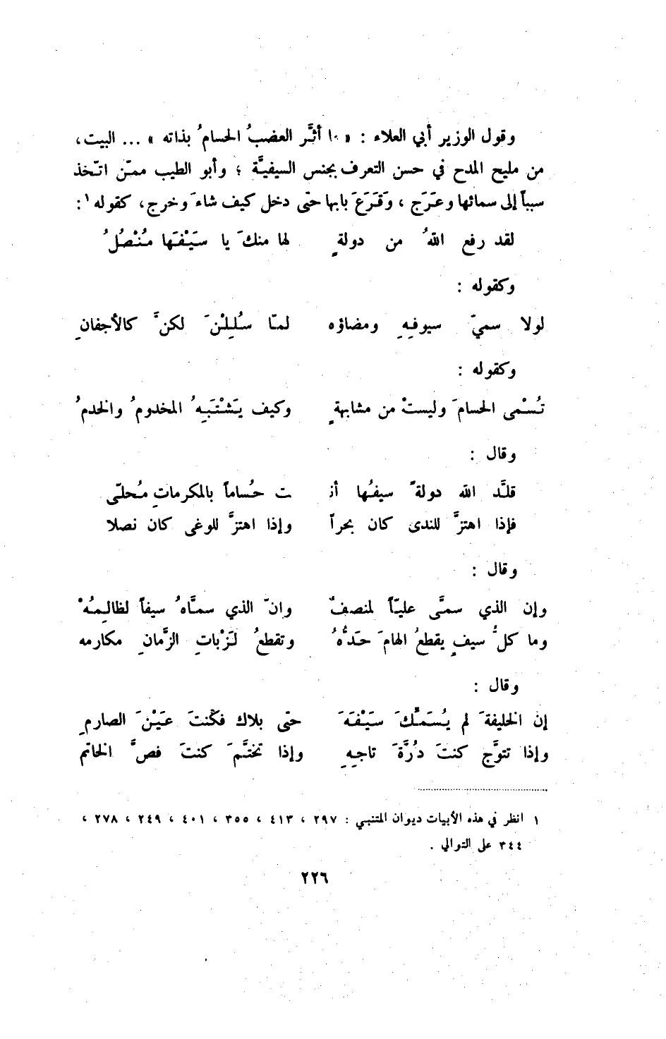 وقول الوزير أبي العلاء: " ما أثر العضب الحسام بذاته " ... البيت، من مليح المدح في حسن التعرف بجنس السيفية؛ وأبو الطيب ممن اتخذ سبباً إلى سمائها وعرج، وقرع بابها حتى دخل كيف شاء وخرج، كقوله: