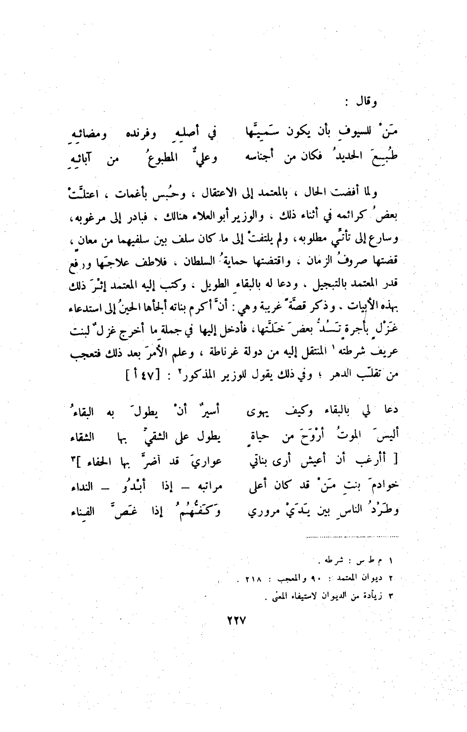 طبع الحديد فكان من أجناسه ... وعلي المطبوع من آبائه ولما أفضت الحال، بالمعتمد إلى الاعتقال، وحبس بأغمات، اعتلت بعض كرائمه في أثناء ذلك، والوزير أبو العلاء هنالك، فبادر إلى مرغوبه، وسارع إلى تأتي مطلوبه، ولم يلتفت إلى ما كان سلف بين سلفيهما من معانٍ، قضتها صروف الزمان، واقتضتها حماية السلطان، فلاطف علاجها ورفع قدر المعتمد بالتبجيل، ودعا له بالبقاء الطويل، وكتب إليه المعتمد إثر ذلك بهذه الأبيات، وذكر قصة غريبة وهي: أن أكرم بناته ألجأها الحين إلى استدعاء غزل بأجرة تسد بعض خلتها، فأدخل إليها في جملة ما أخرج غزل لبنت عريف شرطته المنتقل إليه من دولة غرناطة، وعلم الأمر بعد ذلك فتعجب من تقلب الدهر، وفي ذلك يقول للوزير المذكور: [47أ]
