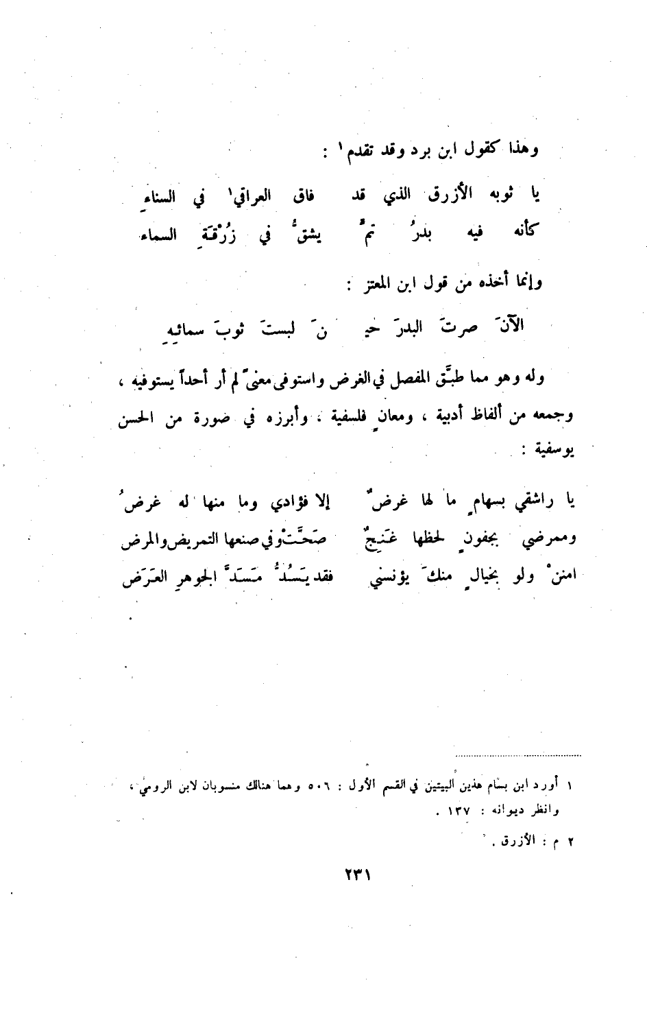 الآن صرت البدر حي ... ن لبست ثوب سمائه وله وهو مما طبق المفصل في الغرض واستوفى معنى لم أر أحداً يستوفيه، وجمعه من ألفاظ أدبية، ومعانٍ فلسفية، وأبرزه في صورة من الحسن يوسفية: