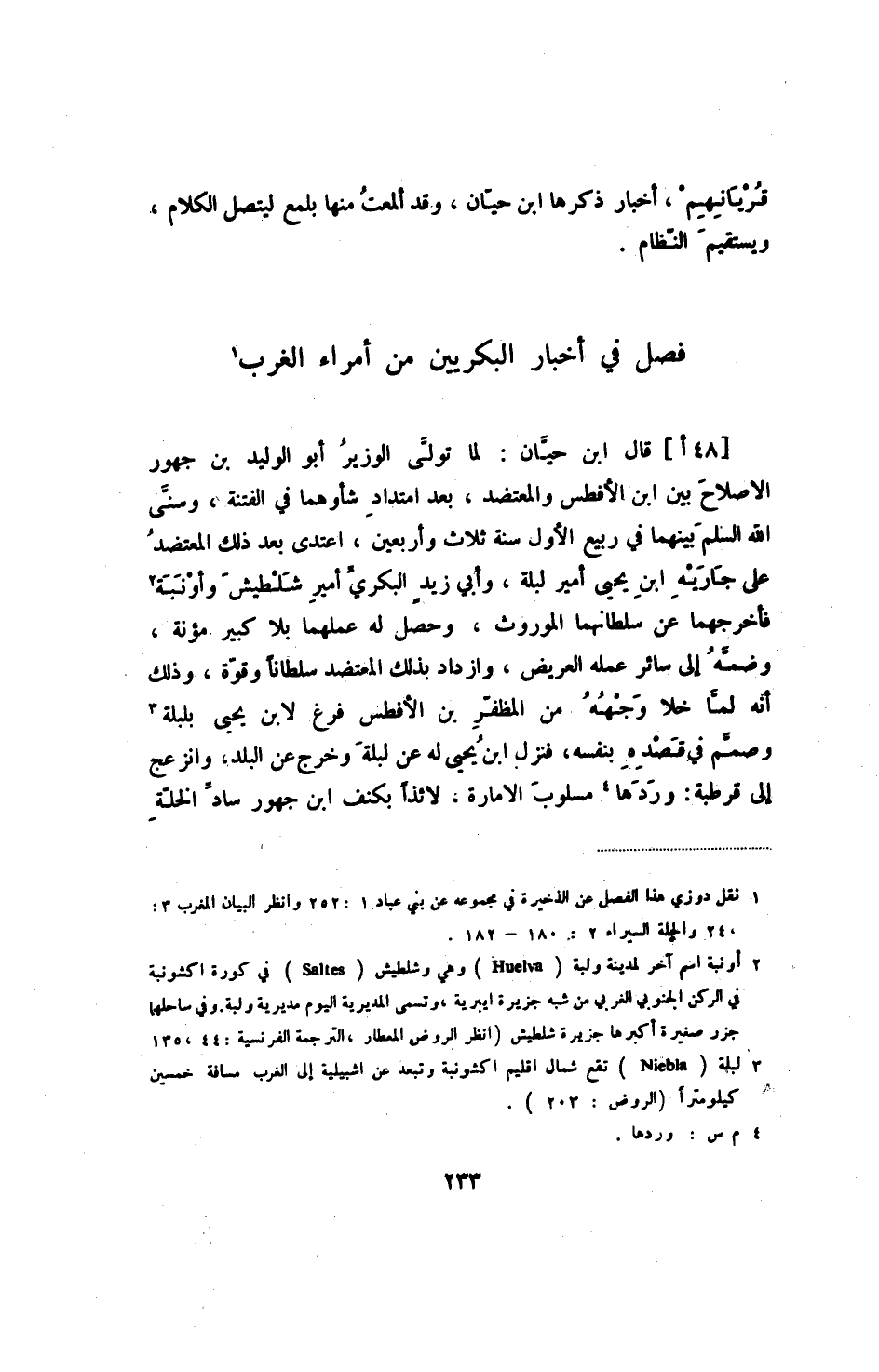 [48أ] قال ابن حيان: لما تولى الوزير أبو الوليد بن جهور الإصلاح بين ابن الأفطس والمعتضد، بعد امتداد شأوهما في الفتنة، وسنى الله السلم بينهما في ربيع الأول سنة ثلاث وأربعين، اعتدى بعد ذلك المعتضد على جاريه ابن يحيى أمير لبلة، وأبي زيد البكري أمير شلطيش وأنبة فأخرجهما عن سلطانهما الموروث، وحصل له عملهما بلا كبير مؤنة، وضمه إلى سائر عمله العريض، وازداد بذلك المعتضد سلطاناً وقوة، وذلك أنه لما خلا وجهه من المظفر بن الأفطس فرغ لابن يحيى بلبلة وصمم في قصده بنفسه، فنزل ابن يحيى له عن لبلة وخرج عن البلد، وانزعج إلى قرطبة: وردها مسلوب الإمارة، لائذاً بكنف ابن جهور ساد الخلة